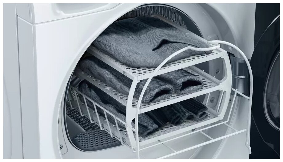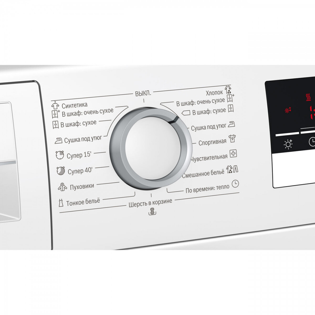 светодиодная индикация заполнения ворсового фильтра и контейнера для конденсата; DUO-Tronic - сенсорный контроль сушки; сигнал окончания хода программы; электромагнитный замок – быстрая разблокировании дверцы по окончании программы и при дозагрузке; длина сетевого кабеля 145,0 см; дополнительная программы сушки: Allergy Plus/Hygiene