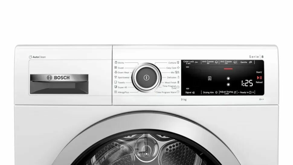 ворсовый фильтр, контроль влажности, отложенный старт, предотвращение сминания, сбор конденсата, установка времени завершения стирки, Отсрочка запуска