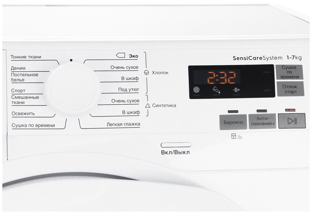 специальные программы: постельное белье, хлопок эко, деликатные вещи, легкая глажка, микс, освежить, сушка по времени
