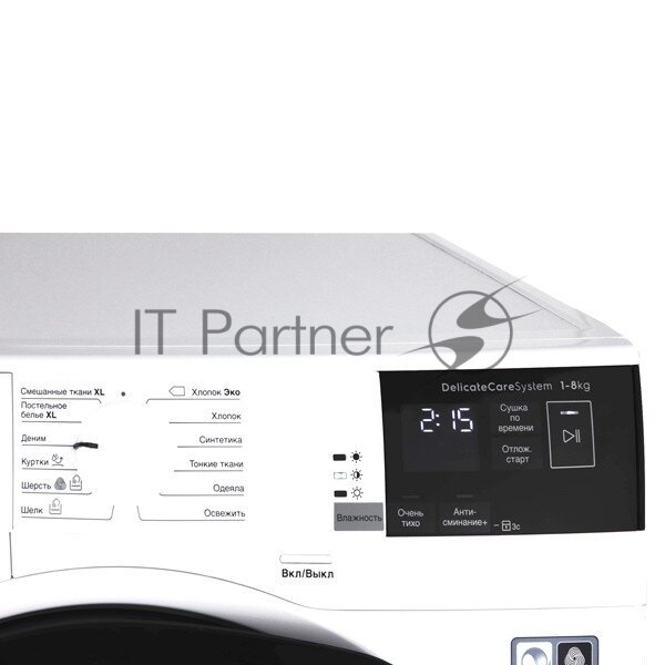 ворсовый фильтр, выбор скорости отжима, контроль влажности, отложенный старт, предотвращение сминания, реверсивное вращение барабана, сбор конденсата, сигнал окончания стирки, установка продолжительности программы, Звуковой сигнал, Контроль остаточной влажности, Отсрочка запуска