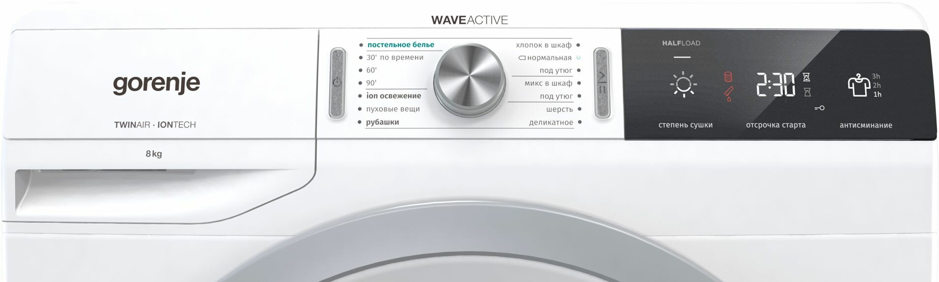 диаметр люка - 350 мм; угол открывания дверцы - 180°; барабан WaveActive; стандартный мотор; специальные программы: ion освежение, микс в шкаф, микс под утюг, хлопок в шкаф, сушка по времени 30 минут, хлопок нормальная, сушка по времени 90 минут, хлопок под утюг, сушка по времени 60 минут; дополнительные функции: настройка степени сушки, половинная загрузка; информация о расходе электроэнергии; TwinAir двухпоточная система подачи воздуха; возможность подключения к сливу; хладагент R134A; изделие содержит фторированные парниковые газы; эквивалент CO2 (т) 0.2; содержание фторированных парниковых газов 0.33 кг; герметичная система; ножки-присоски для установки в колонну приобретаются отдельно