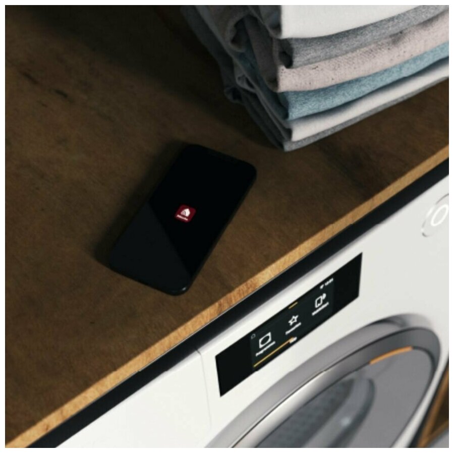Удаленное управление настраивается при помощи мобильного приложения Miele@home, программа Wash2Dry дает возможность настроить совместную работу со стиральной машиной, параметры сушки выставляются автоматически в зависимости от условий стирки.