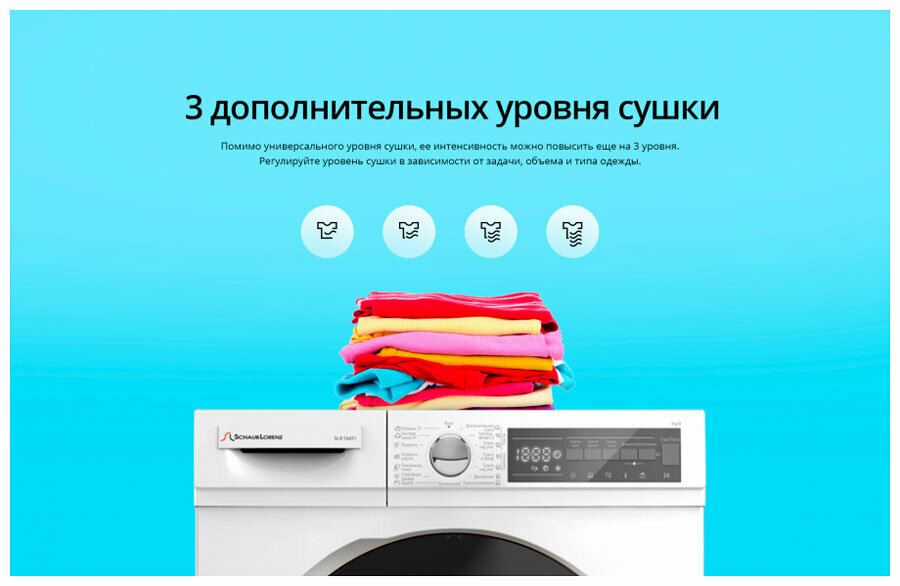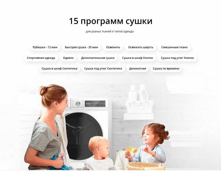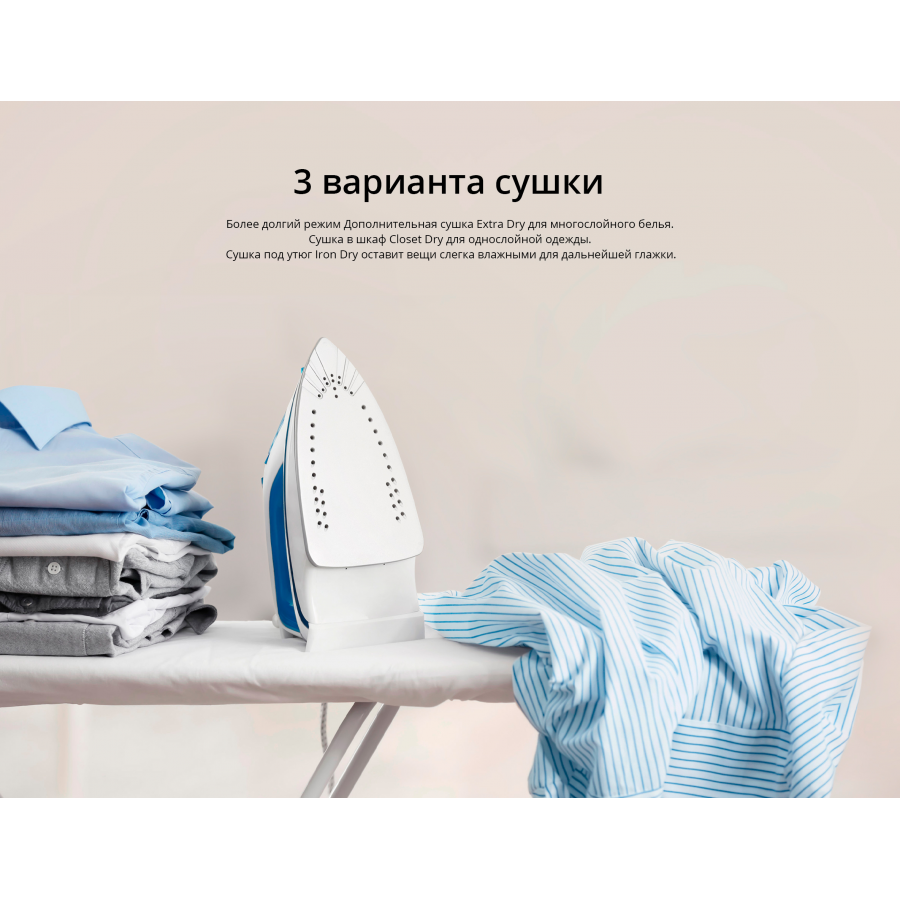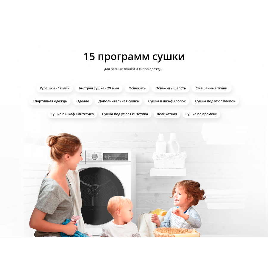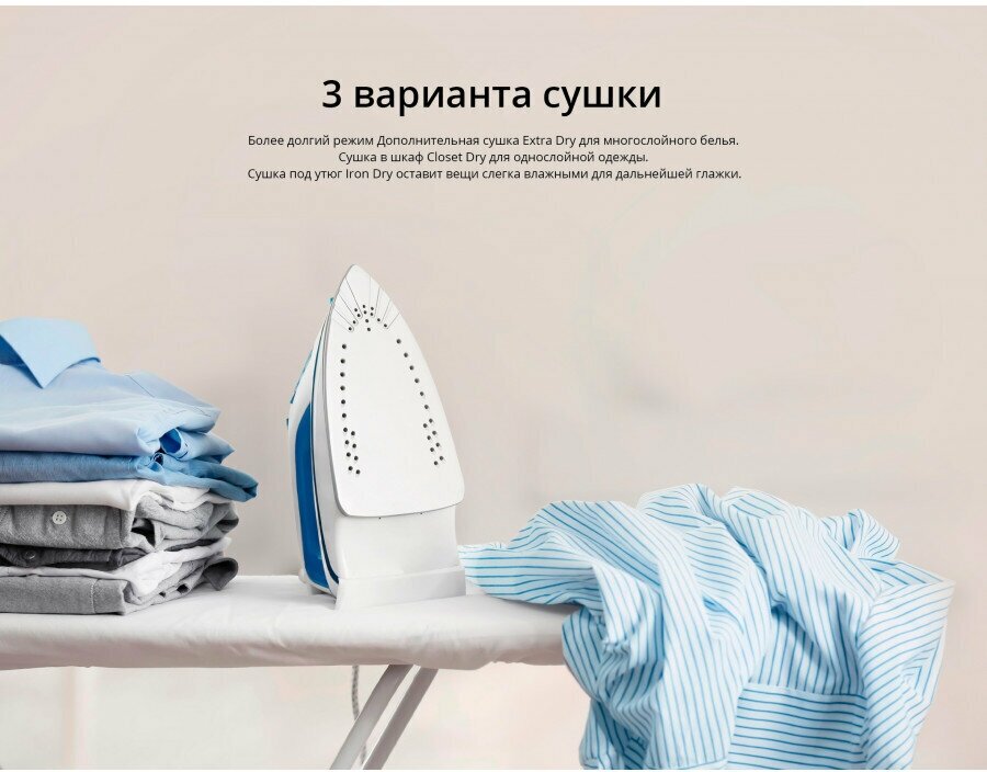 бережная сушка, быстрая сушка, детская одежда, джинсы, лёгкая глажка, сорочки (рубашки), Звуковой сигнал, Контроль остаточной влажности, Отключение звукового сигнала, Отсрочка запуска