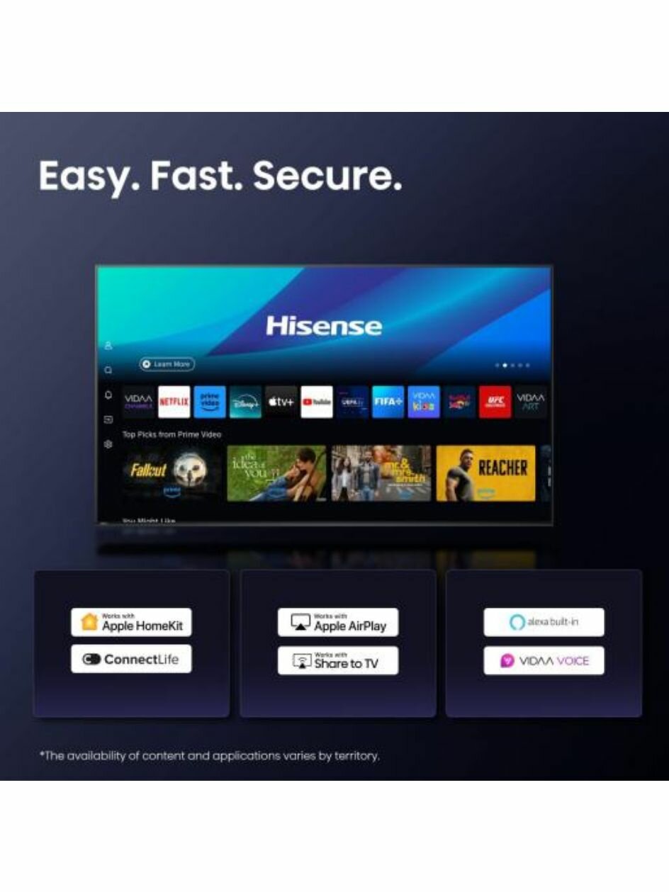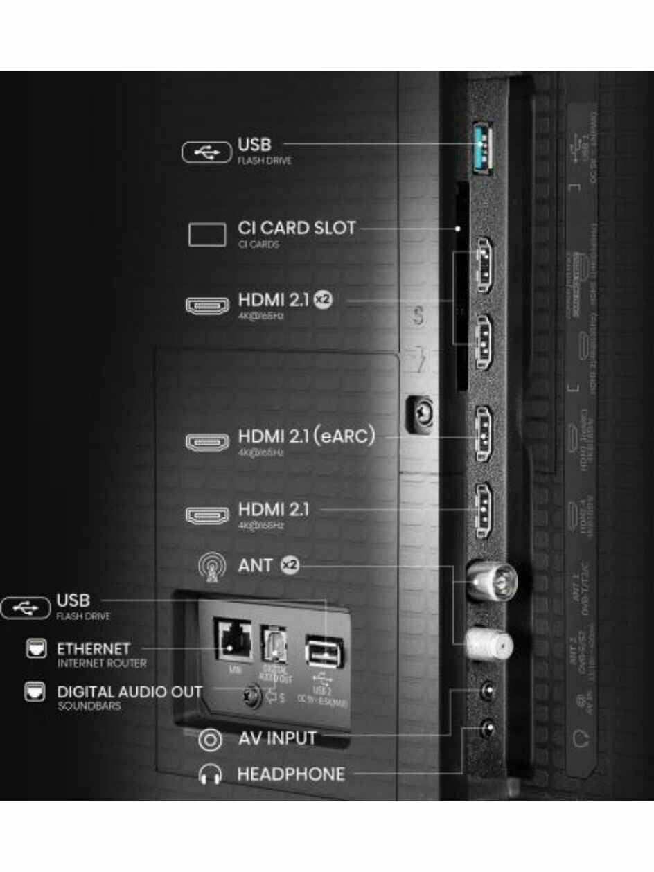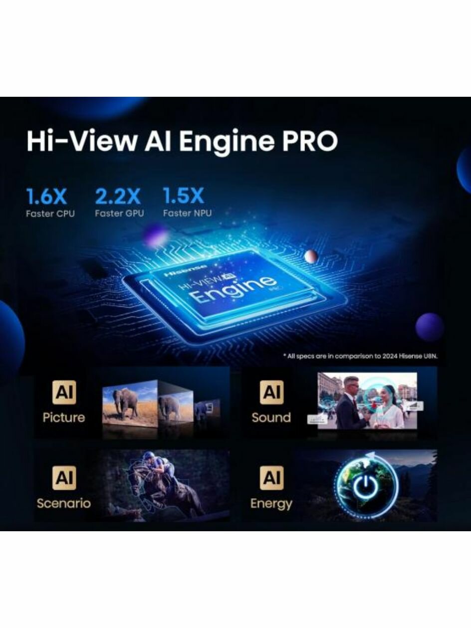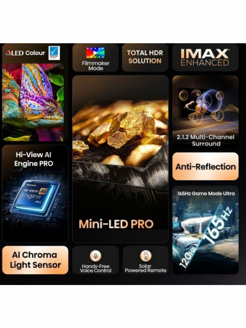 режим режиссёра Filmmaker Mode, спортивный режим AI Sports Mode, игровой режим Game Mode Ultra, FreeSync Premium Pro, Game Bar, VRR (Variable Refresh Rate) 48-165 Гц, ALLM (Auto Low Latency Mode), поддержка Apple Airplay2, датчик освещённости Al Chroma Light Sensor, зеркальное отображение экрана (совместимость с Android), технология Hisense Anti-Reflection, IMAX Enhanced