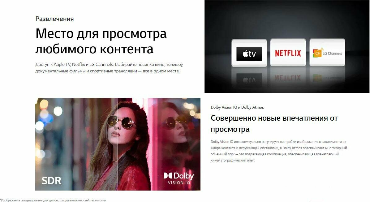 DLNA, Time Shift, голосовое управление, гостиничный ТВ, запись видео (PVR), игровой режим, телетекст, DivX, HEVC (H.265), JPEG, MKV, MPEG4, WMA, Гостиничный режим, Поддерживаемые форматы MP3, Пульт ДУ, Управление голосом, Управление со смартфона, графический процессор alpha7 gen IV, игровые режимы VRR/ALLM, поддержка Dolby Atmos, пульт Magic Remote в комплекте, технология WiSA Speakers