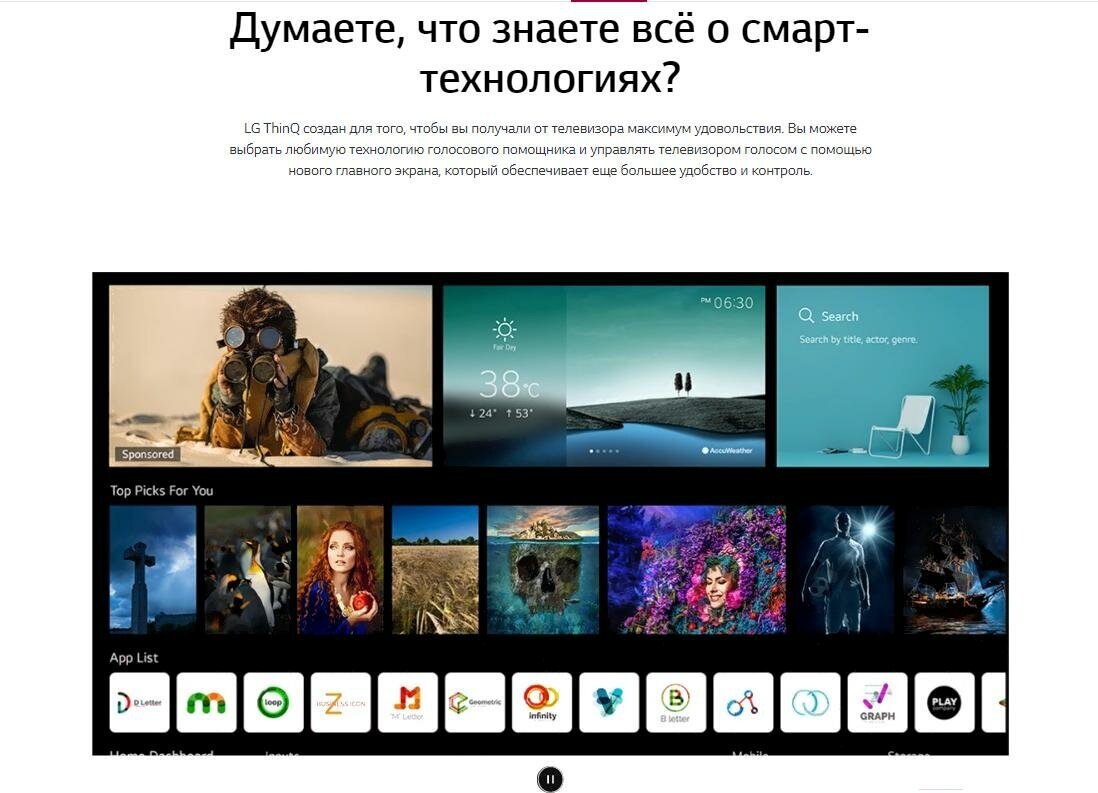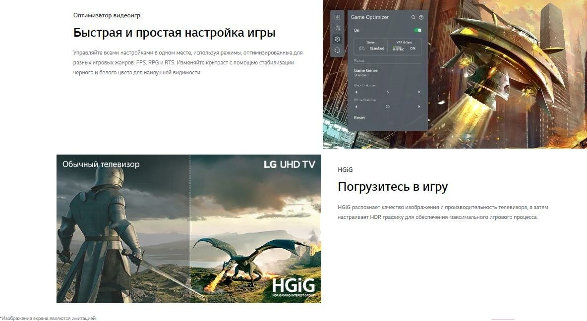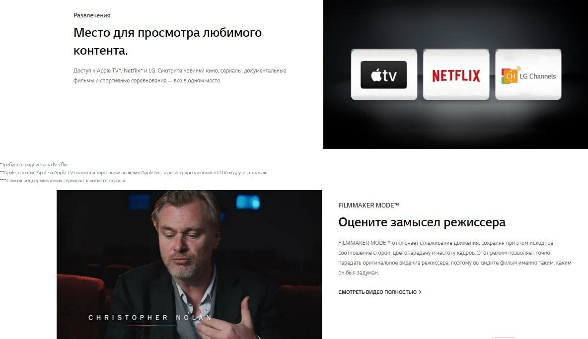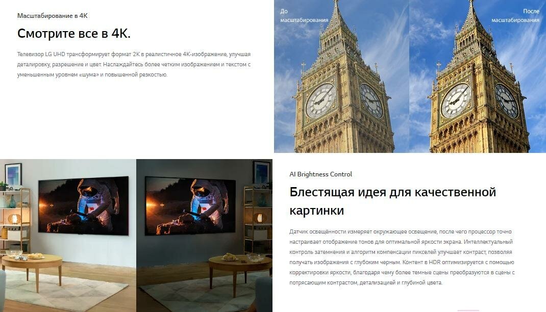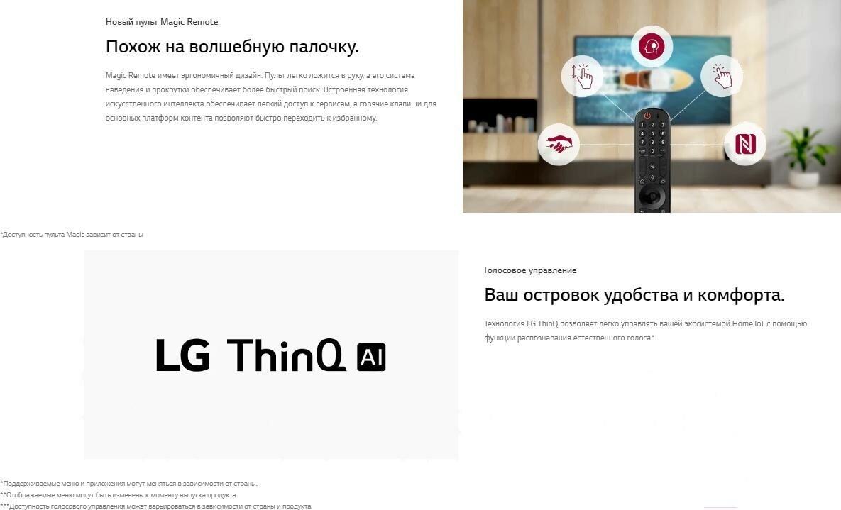 9 режимов (яркий, стандартный, Эко, кино, спорт, игры, Filmmaker, (ISF) эксперт (Светлая комната), (ISF) эксперт (тёмная комната)), технология LG ThinQ, Speech to Text, технология AI UX, технология AI Recommendation, Home Dashboard, технология Mobile Connectivity, технология AI Home, технология Apple Homekit, технология Screen Share, поддержка Умных колонок, работа с приложением Apple AirPlay 2, интеллектуальное распознавание голоса, функция Виртуальная реальность, Quick Access, магазин контента и приложений LG, браузер, DIAL, поддержка Bluetooth Low Energy, спортивное оповещение