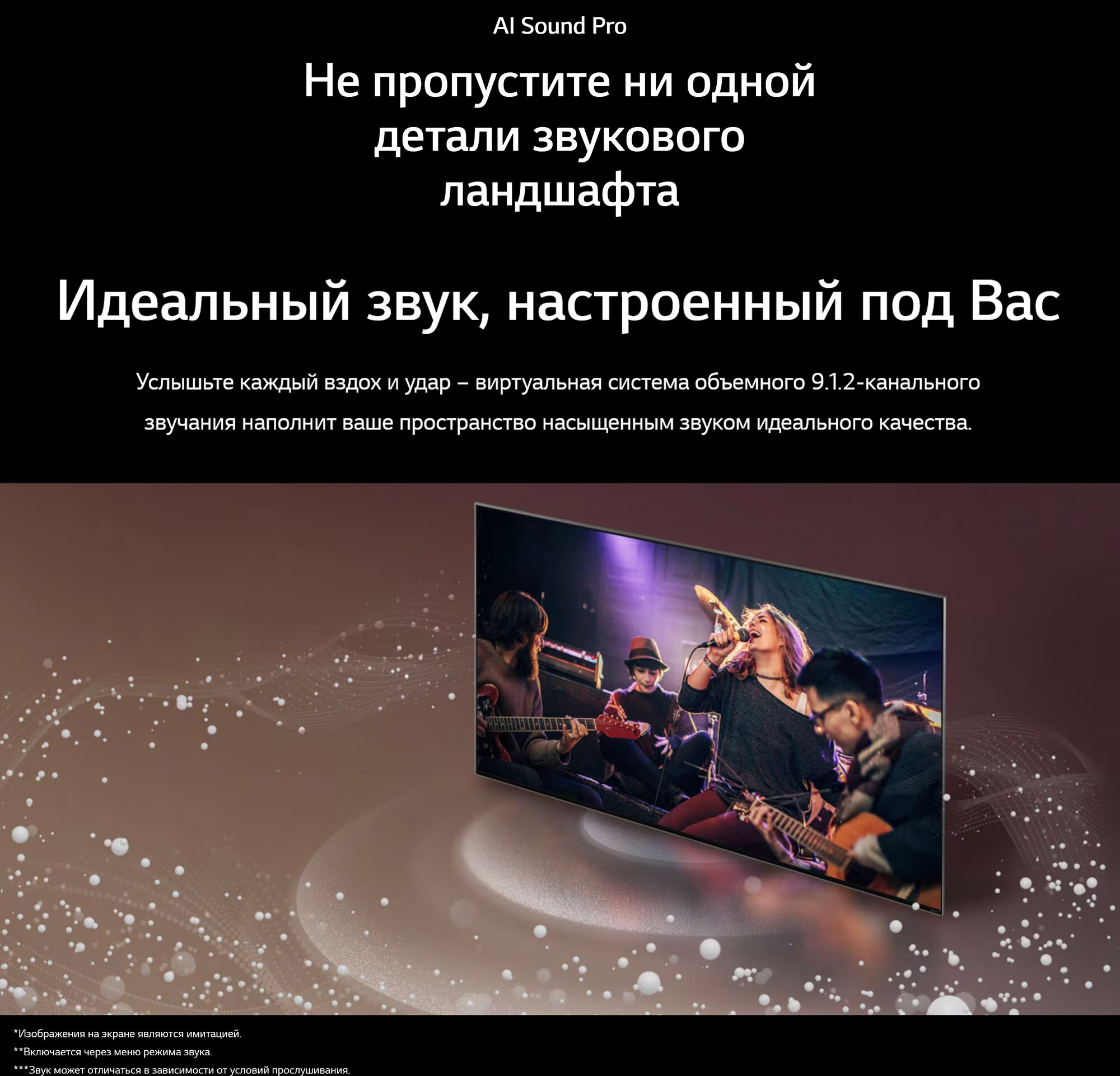 Dolby Audio, Dolby Digital, автоматическое выравнивание громкости, стереозвук, AI Sound Pro, Clear Voice Pro, LG Sound Sync