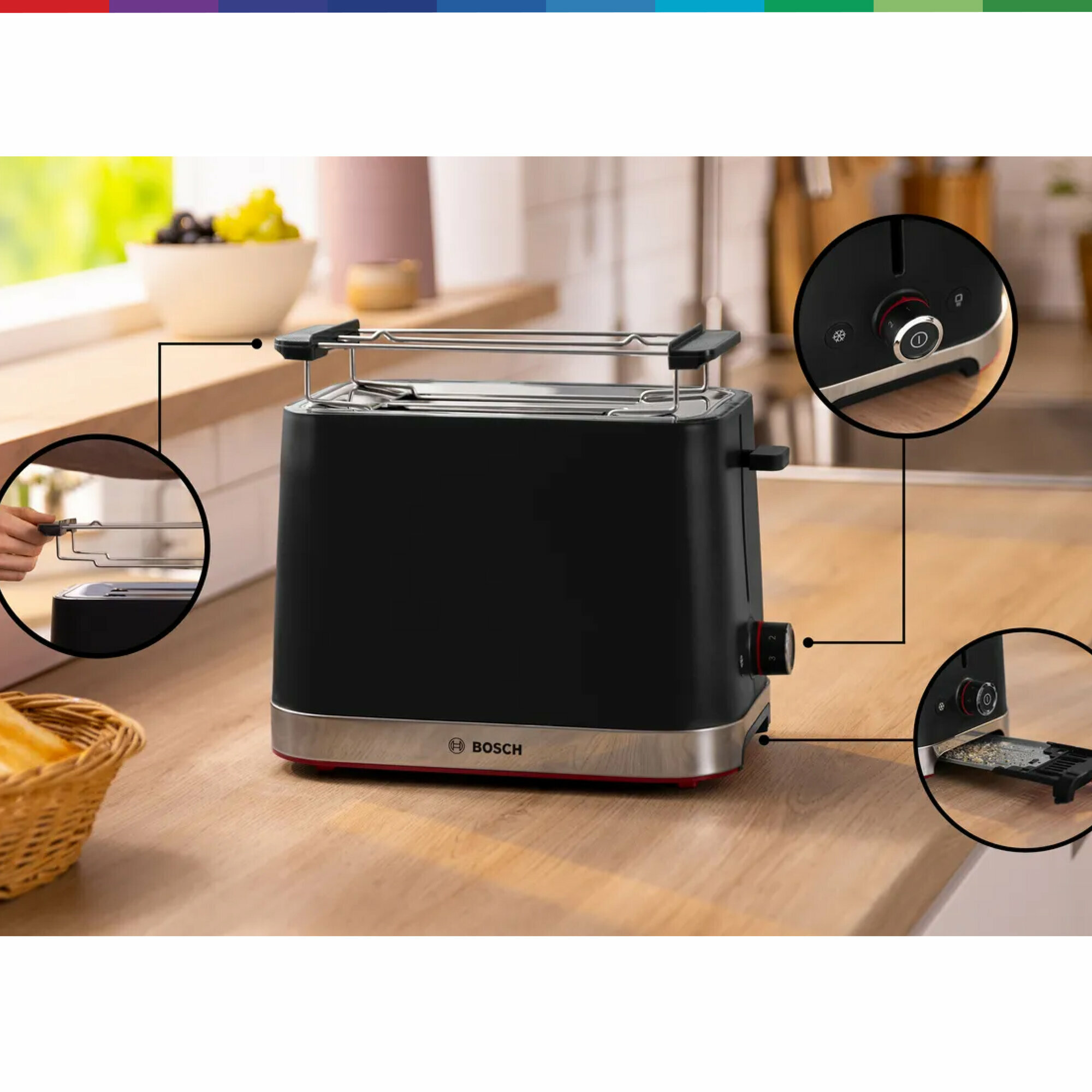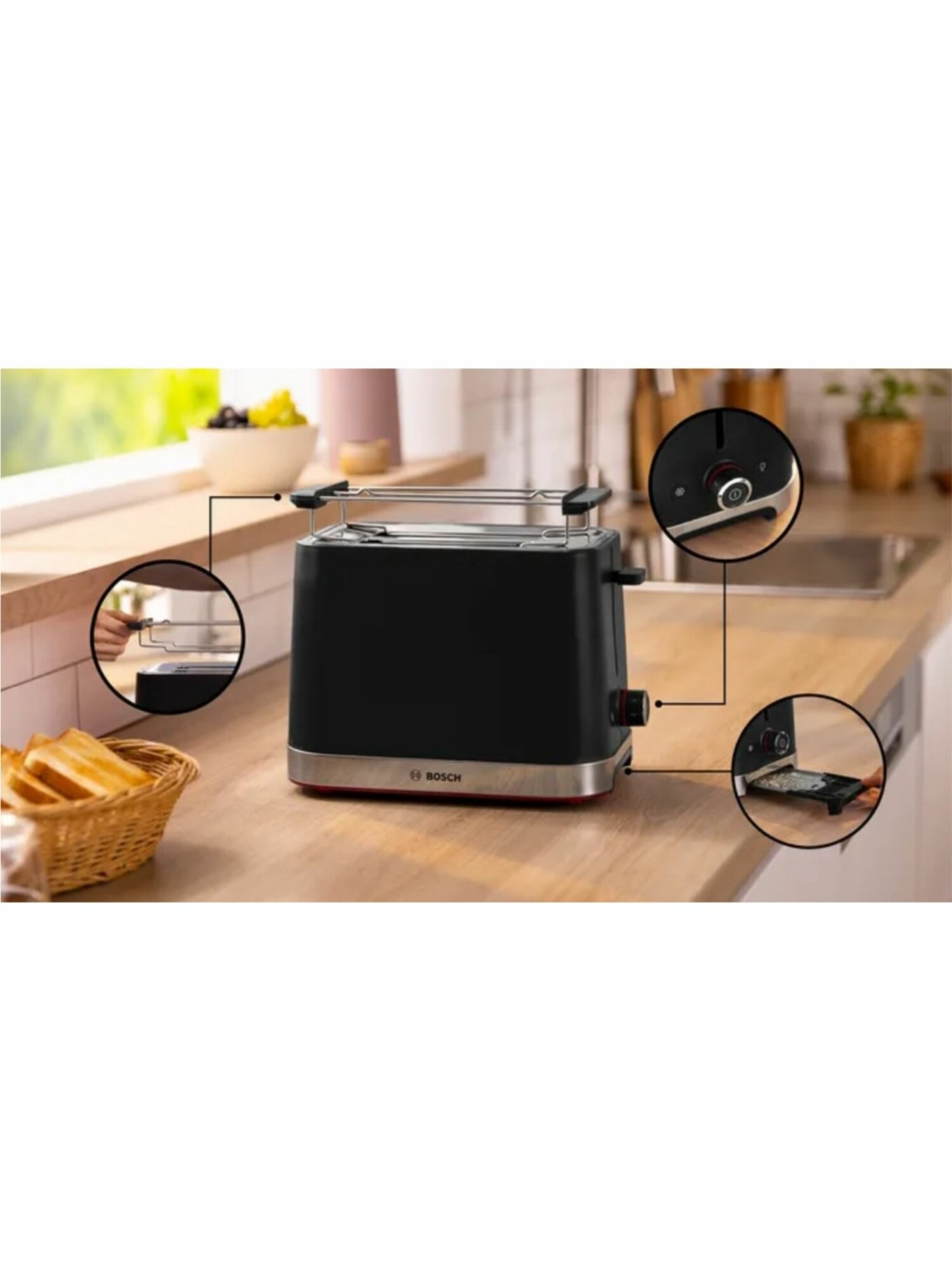 поддон для крошек, решетка для подогрева булочек, Bosch TAT4M223 Тостер, Документация, Инструкция, Поддон для крошек подставка для подогрева булочек, Черный, тостер