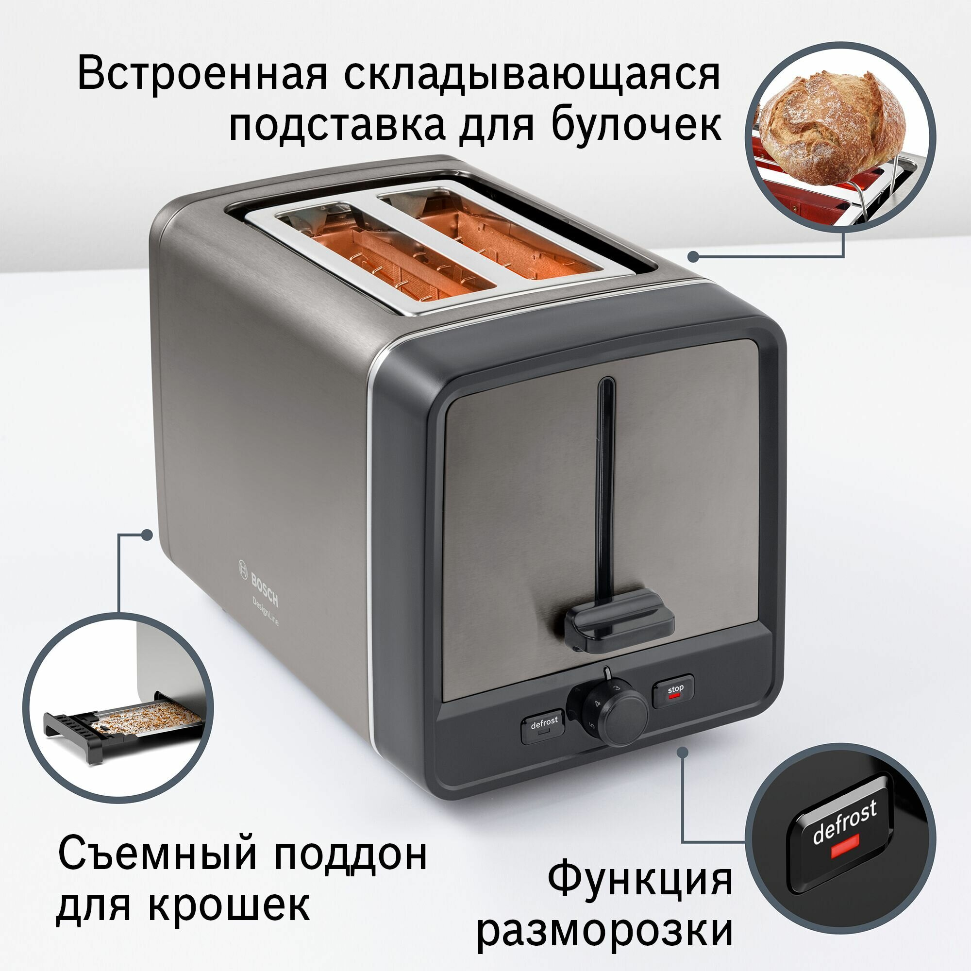 отсек для шнура, термоизолированный корпус, Автоматическое поднятие, Автоматическое центрирование тостов, Кнопка отмены, Поддон для крошек, Прорезиненные ножки, Регулировка степени обжаривания, Решетка для подогрева, Экстра-подъем тостов, бесступенчатый терморегулятор, лоток для крошек, поддон для крошек, разморозка, разморозка, решетка для подогрева булочек, функция подогрева, регулировка температуры, решетка для подогрева булочек, функция подогрева