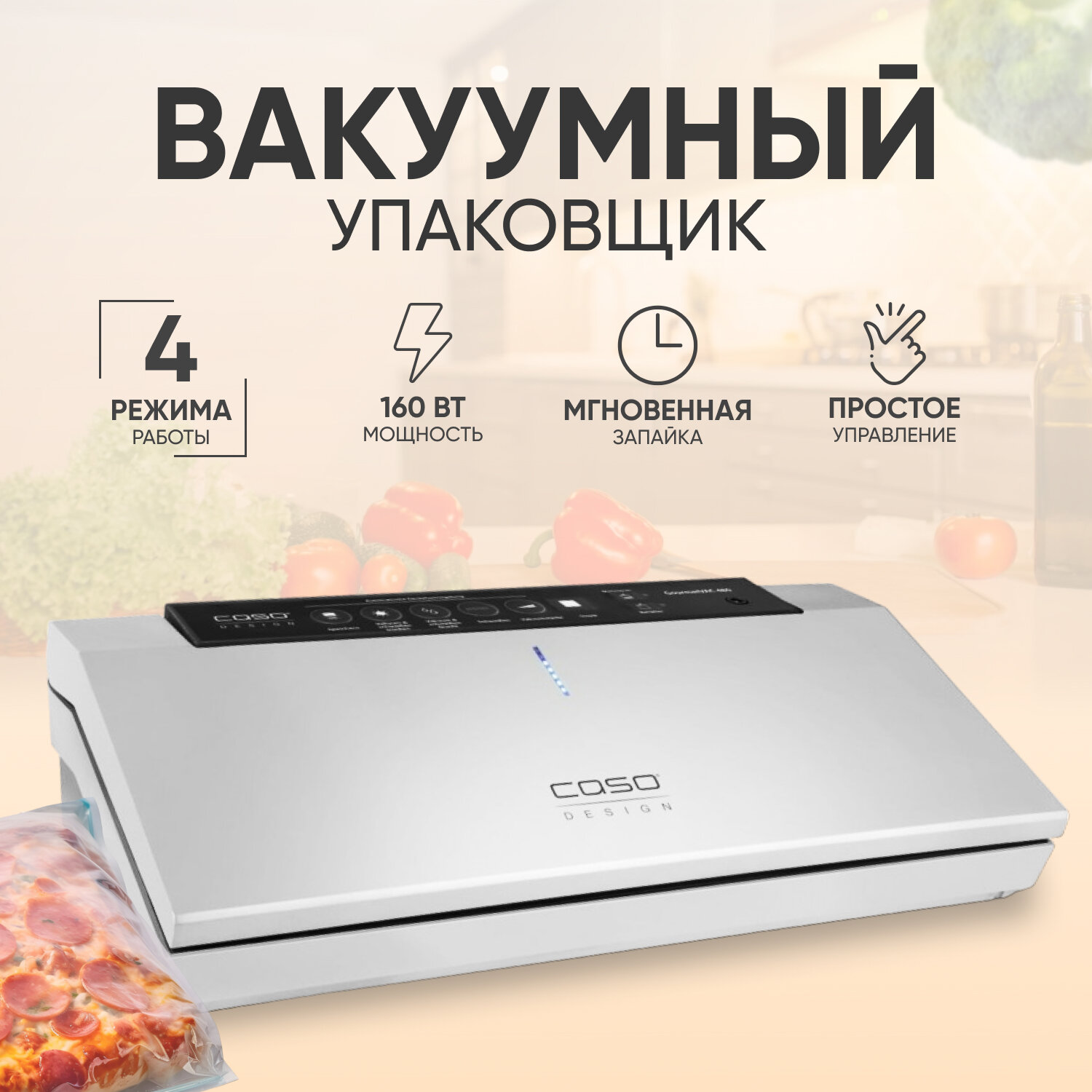 автоматическое запирание крышки, встроенный контейнер для рулона, встроенный резак для пленки, двухпоршневый насос, запаивание двойным сварочным швом, импульсный режим, откачивание воздуха из контейнеров, режим для влажных и сухих продуктов, режим маринования, светодиодная индикация работы, съёмная вакуумная камера, функция «Память»