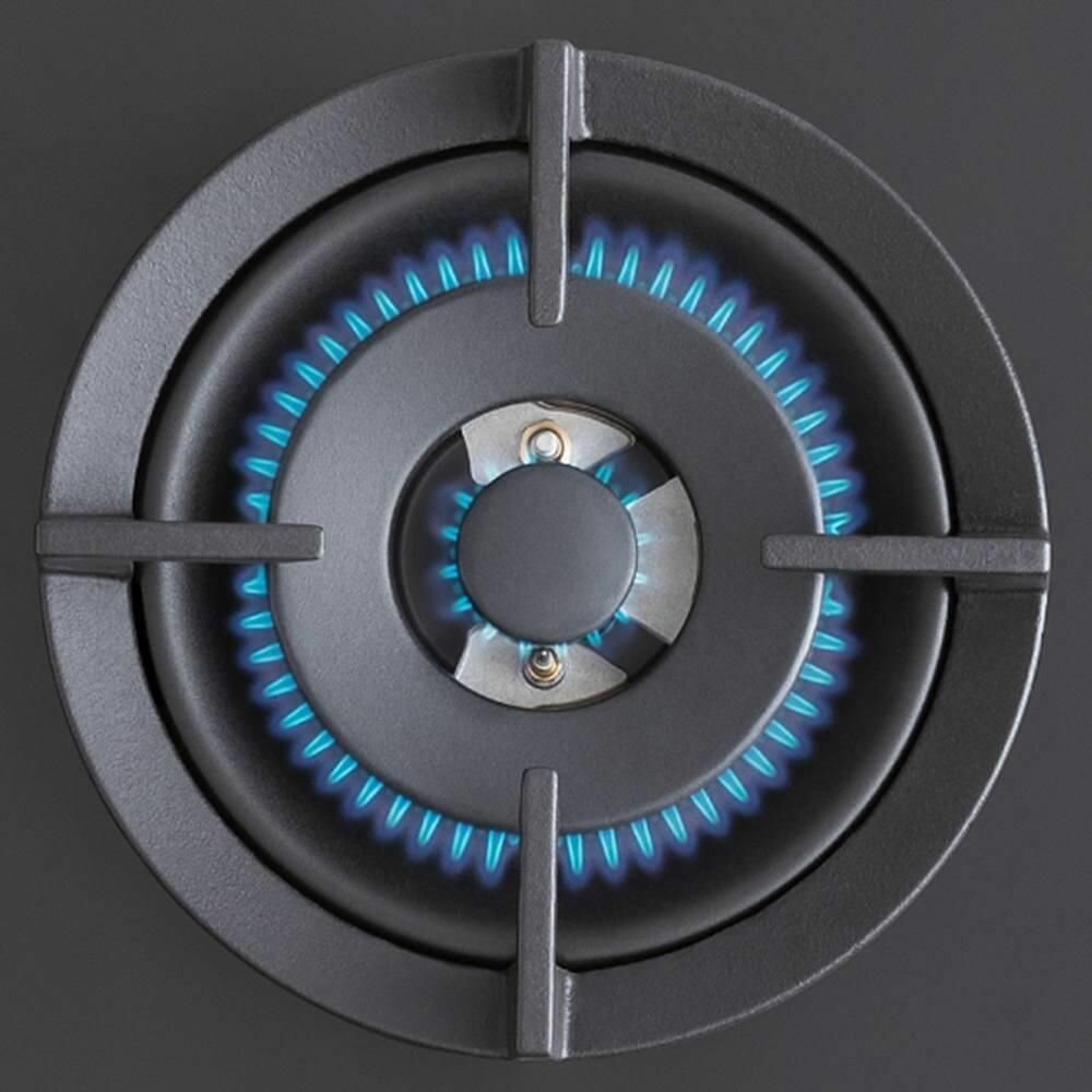 Bertazzoni P905LMODGNE - газовая плита из закаленного черного стекла. Прочные чугунные решетки обеспечивают устойчивость посуды. С автоподжигом можно включить устройство одним касанием. Имеет двойную конфорку вок мощностью до 5 кВт с тройным рядом пламени. Функция газового контроля отвечает за безопасную работу.
