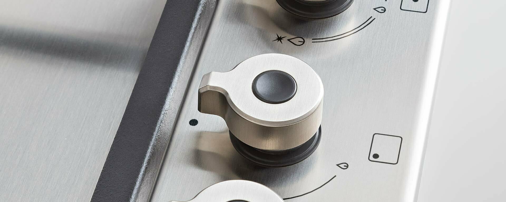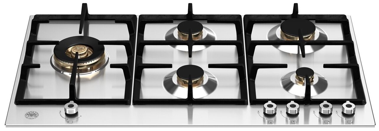 Газовая варочная панель Bertazzoni P905LPROX Professional range изготовлена из нержавеющей стали, кнопки управления - также из металла. Благодаря такому дизайну модель очень универсальна и подойдет как для классических, так и для современных кухонь разных цветов. На поверхности пять тарелок с разной потенцией. Самая мощная конфорка WOK с двумя рядами пламени сдвинута влево - это изолированное положение дополнительно защищает от пламени и горячего воздуха во время готовки. Все конфорки покрыты чугунными решетками, на которых устойчива посуда любого размера. Управление осуществляется вращающимися ручками с наконечниками для увеличения и уменьшения активности пламени.