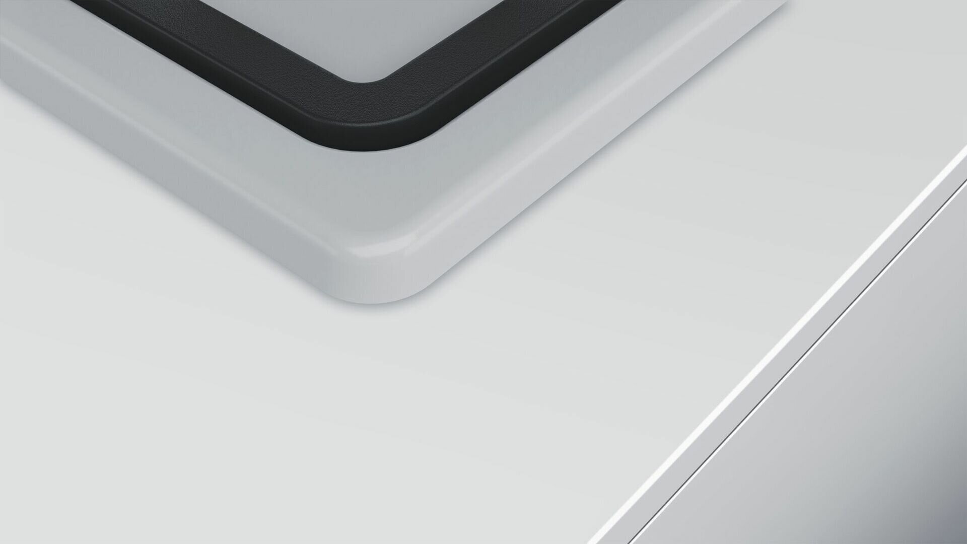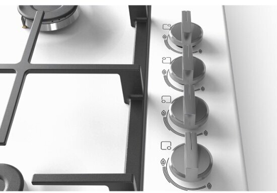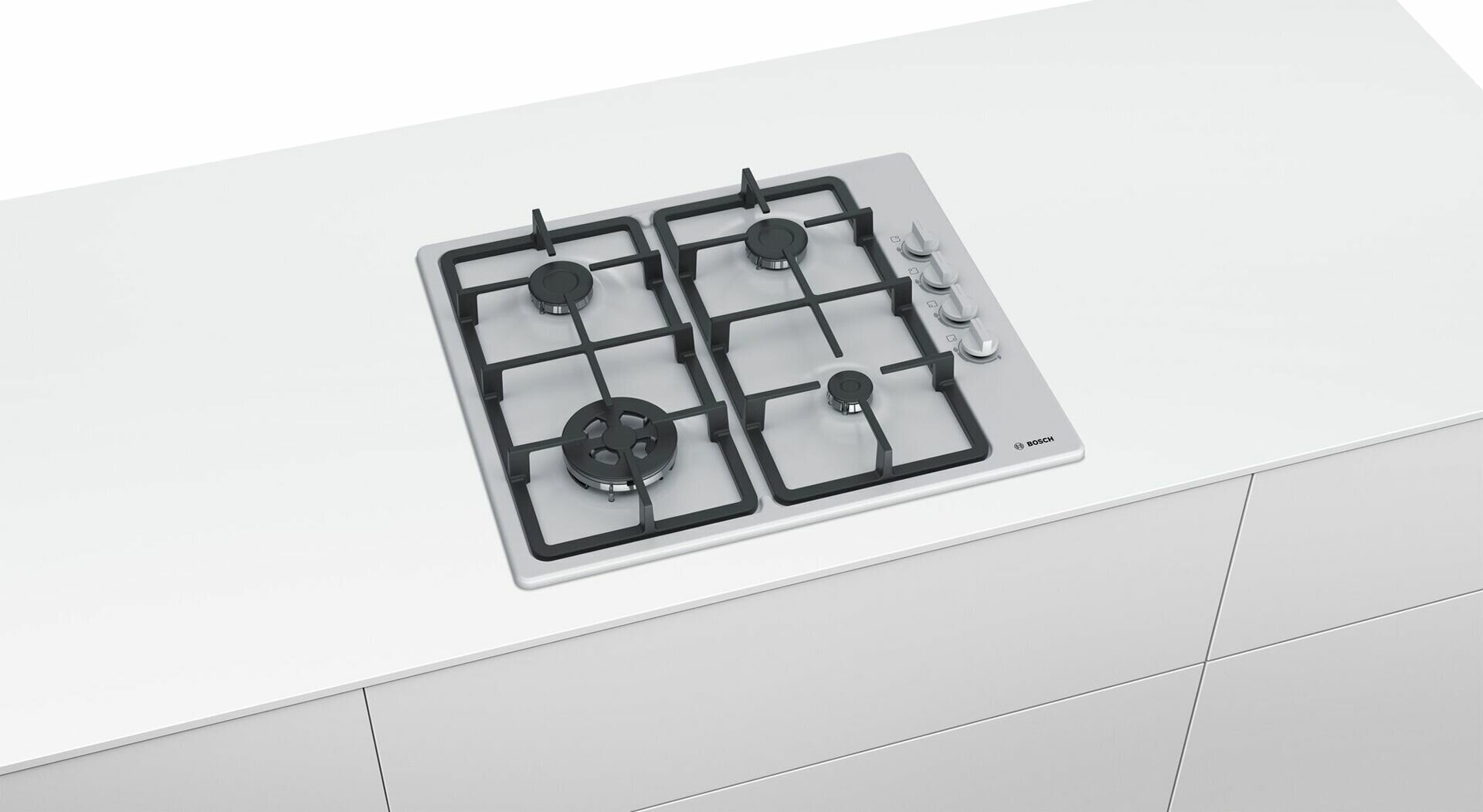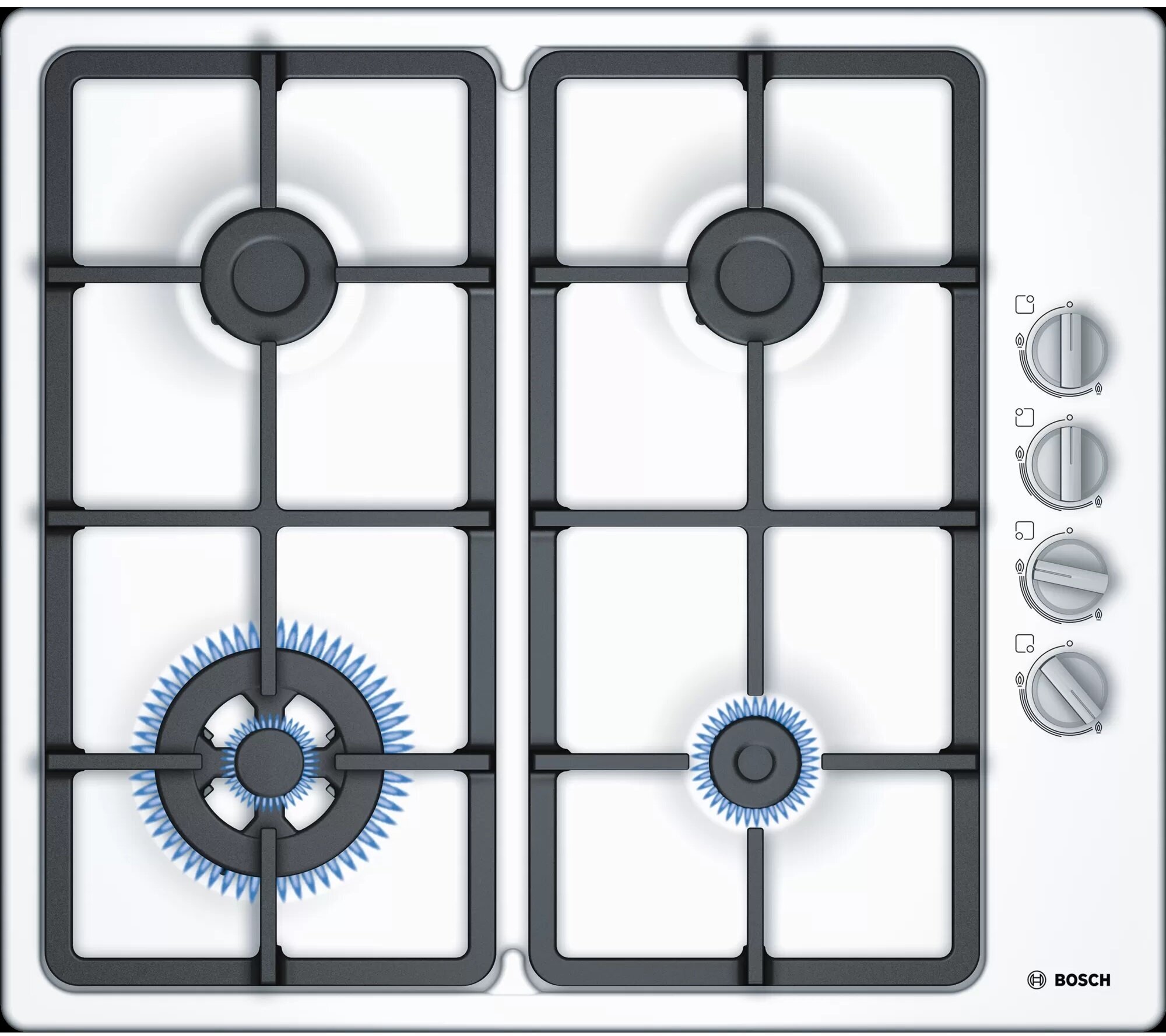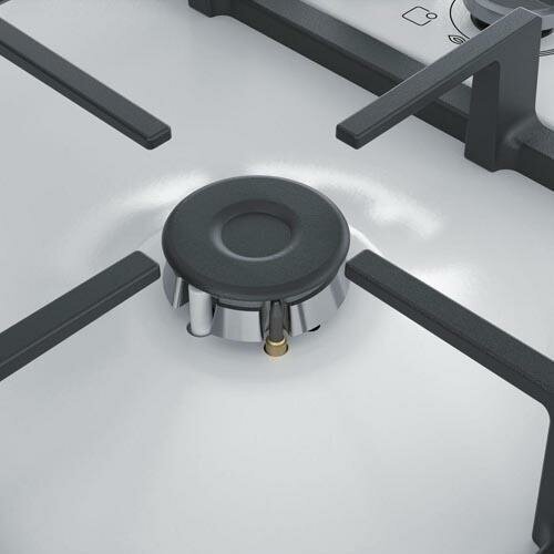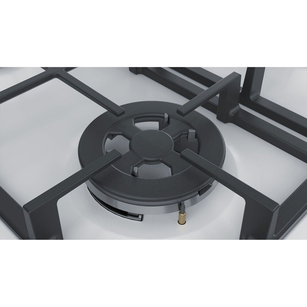 Газовая варочная панель белого цвета Bosch PBH6C2B90R с боковым расположением переключателей.