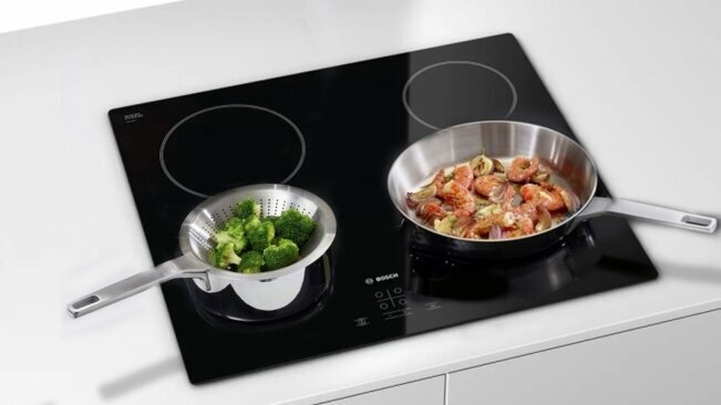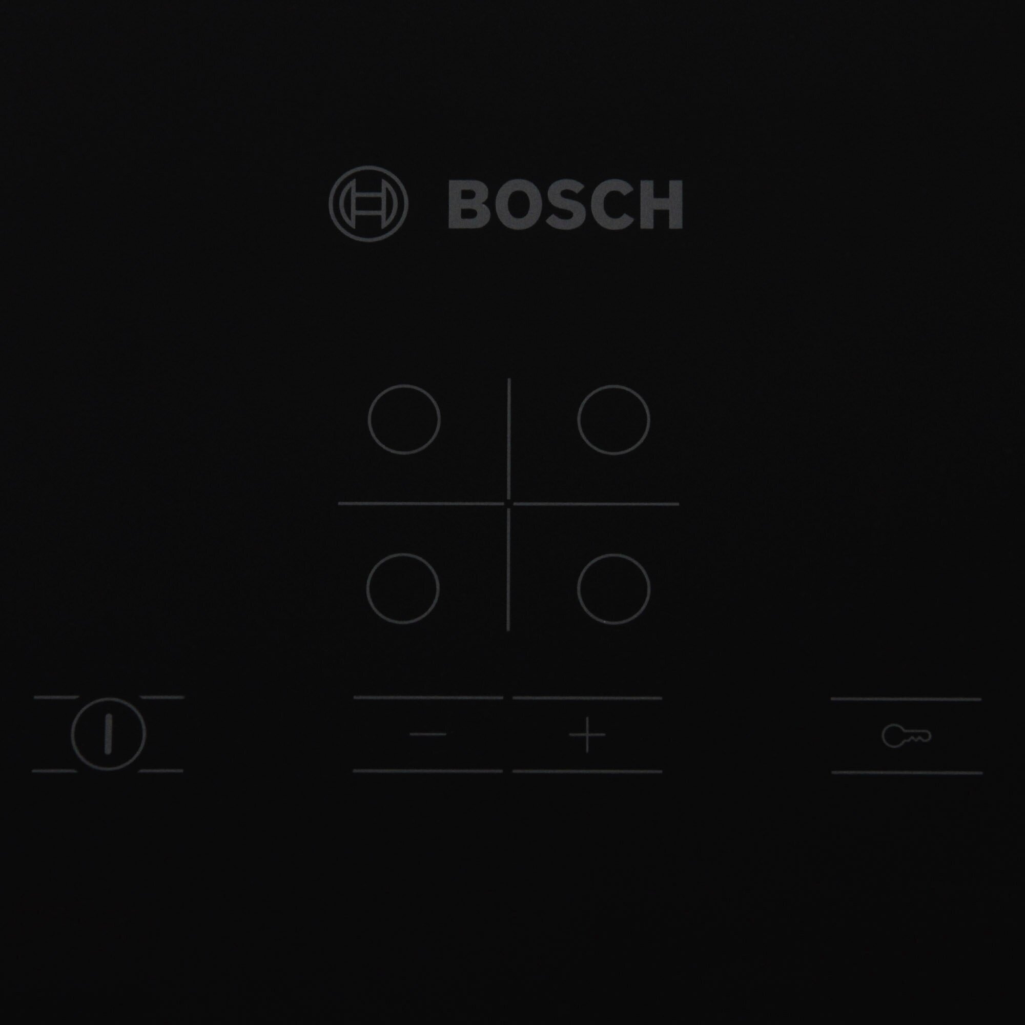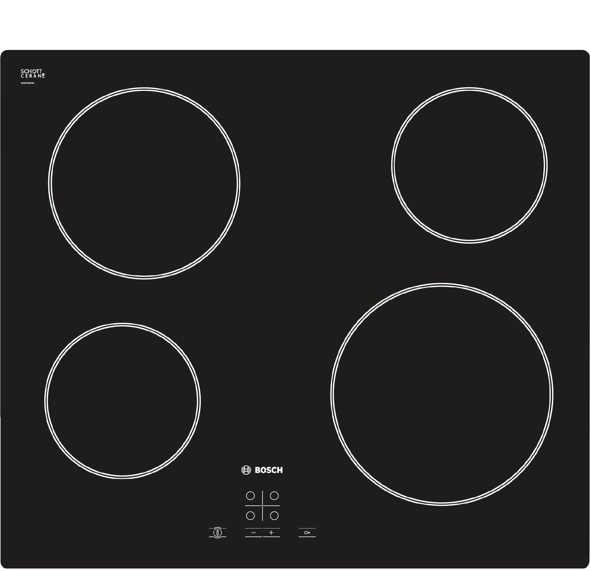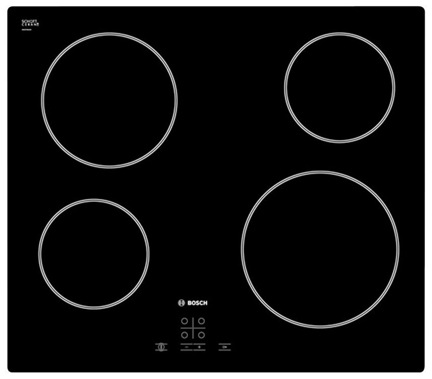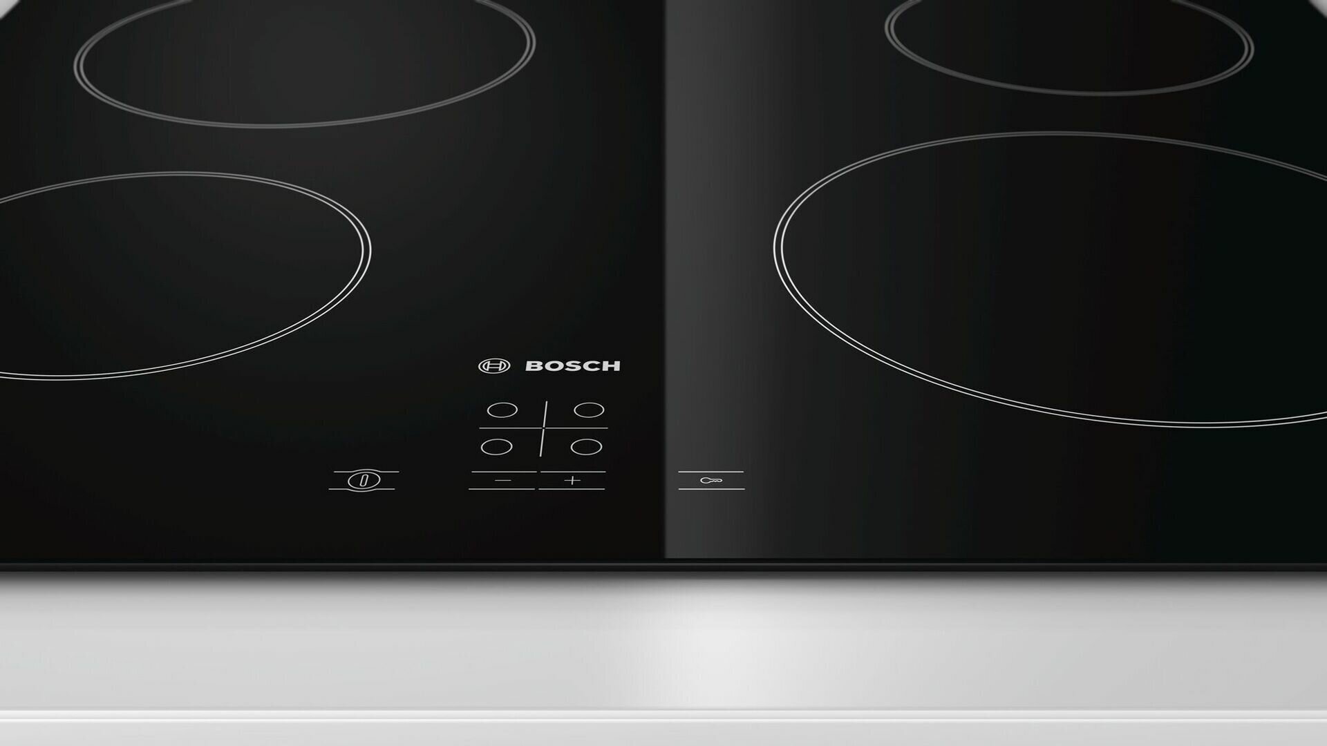 Независимая варочная панель Bosch PKE611D17E с четырьмя электрическими конфорками. Для удобства доступна панель управления TouchSelect при выборе нужной зоны нагрева и установке необходимого уровня мощности.