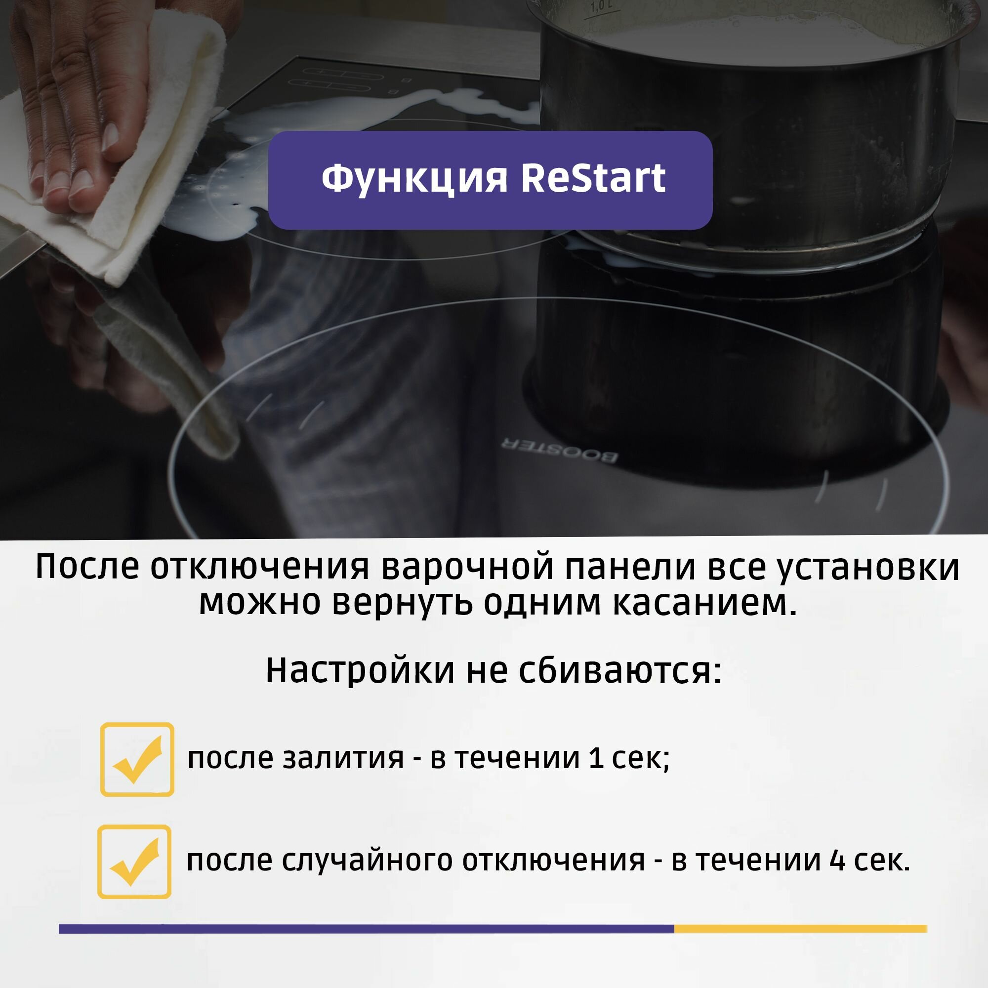 кратковременная пауза, поддержание тепла, распознавание наличия посуды, таймер, функция Booster, функция ReStart, Booster, Быстрый нагрев