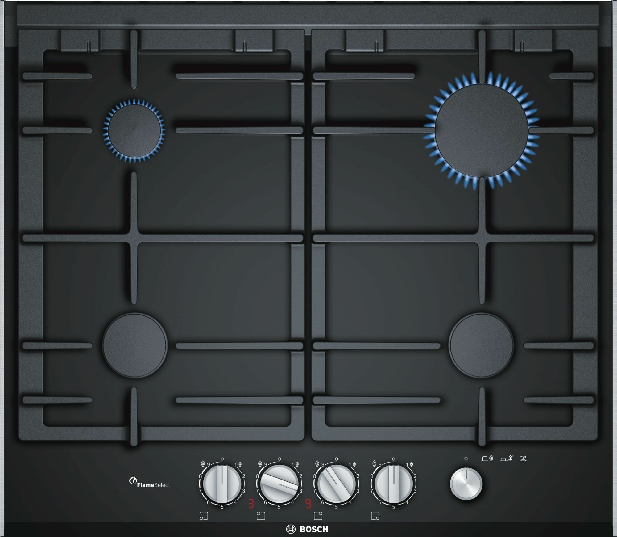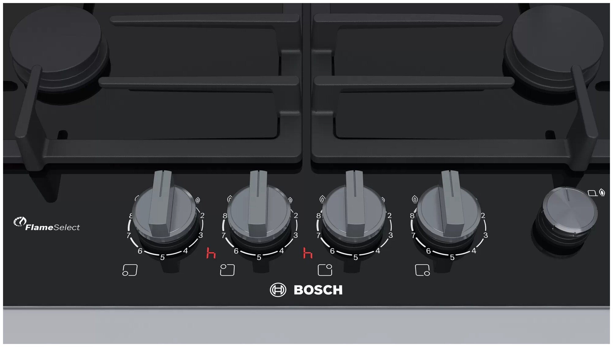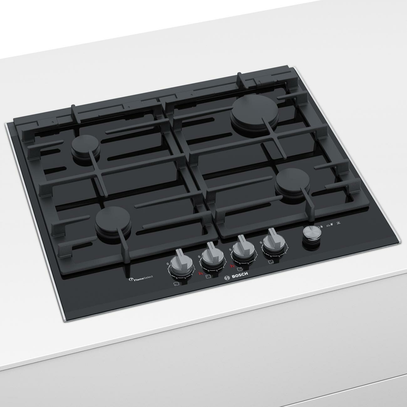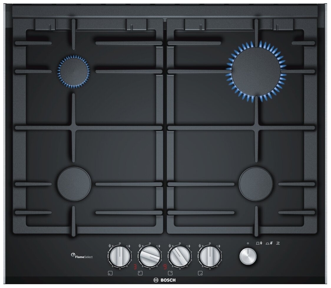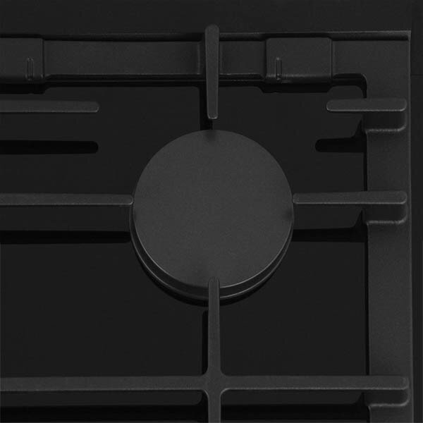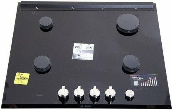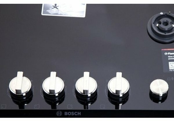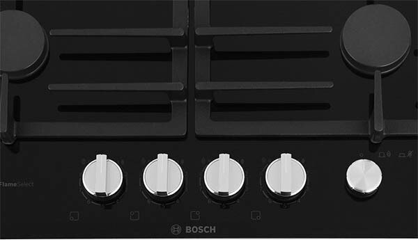 Газовая варочная панель Bosch PRP6A6N70R с черной стеклокерамической рабочей поверхностью оснащена прочными чугунными решетками, которые можно мыть в посудомоечной машине.