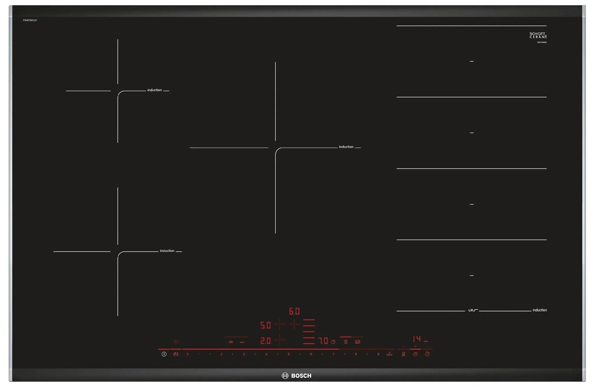 кратковременная пауза, поддержание тепла, распознавание наличия посуды, таймер, функция Booster, функция Flex Zone, функция ReStart, Быстрый нагрев, Индукционный мост, Расширение зоны нагрева, индикатор остаточного тепла