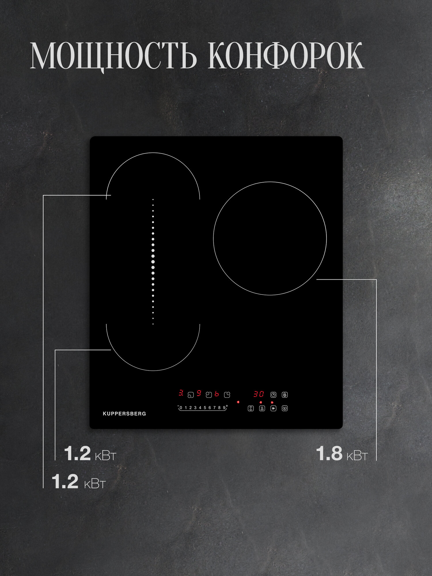 Зоны нагрева: 165mm, 1200W+165mm, 1200W+200mm, 1800W