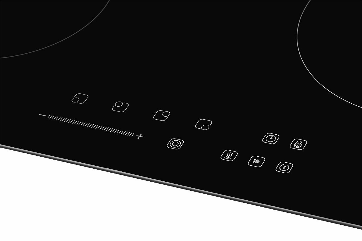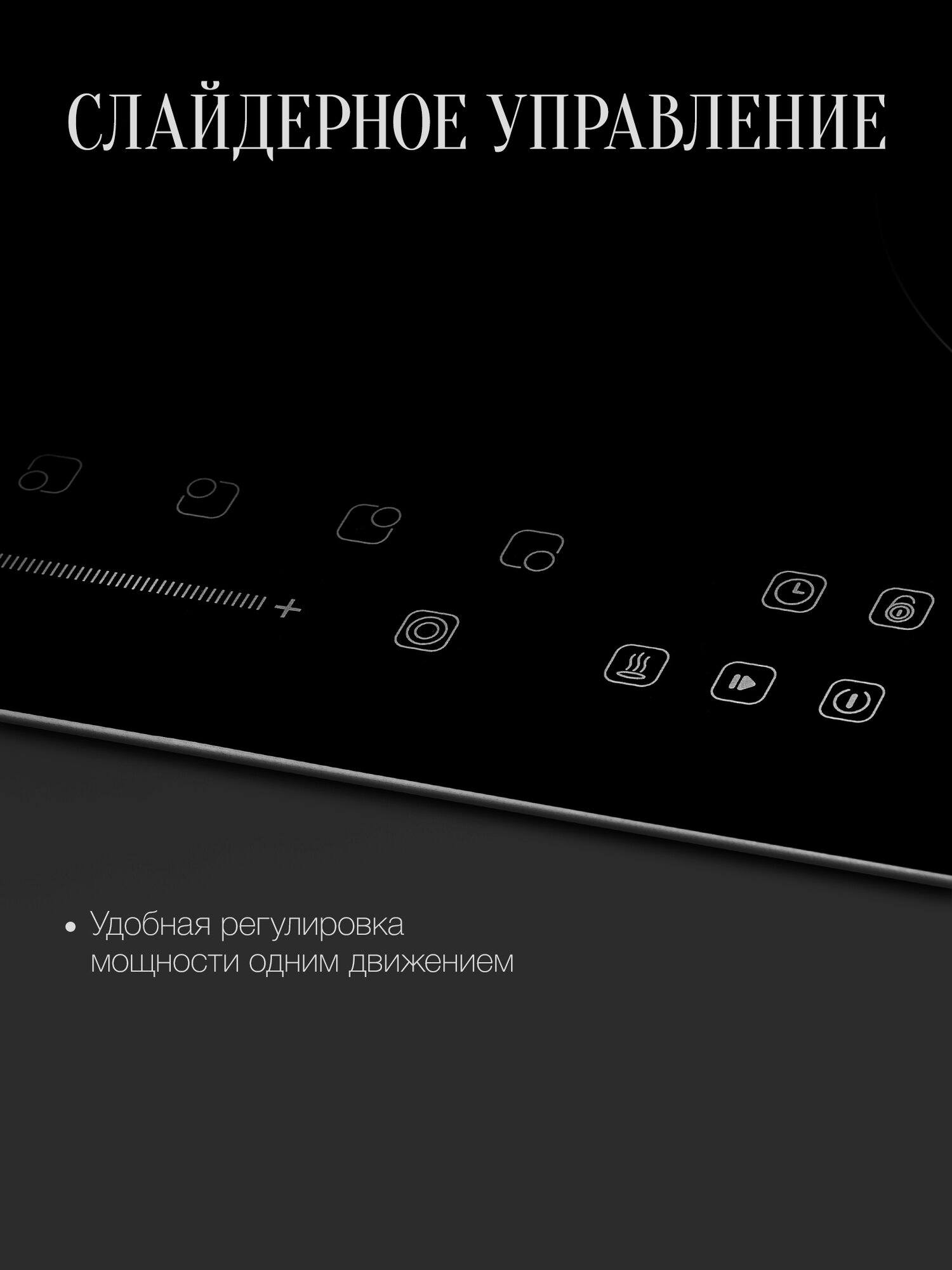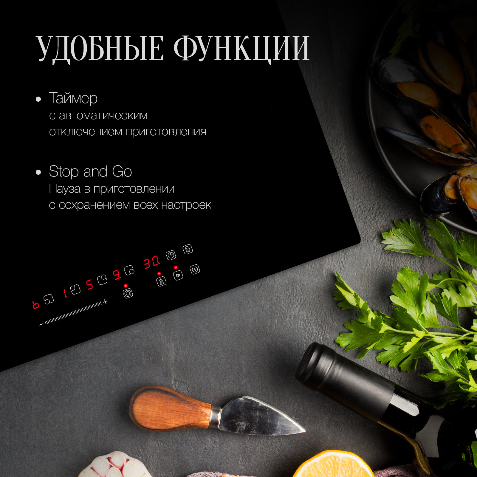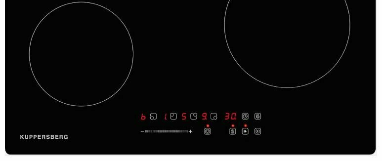 защитное отключение конфорок, индикатор остаточного тепла, кнопка блокировки панели