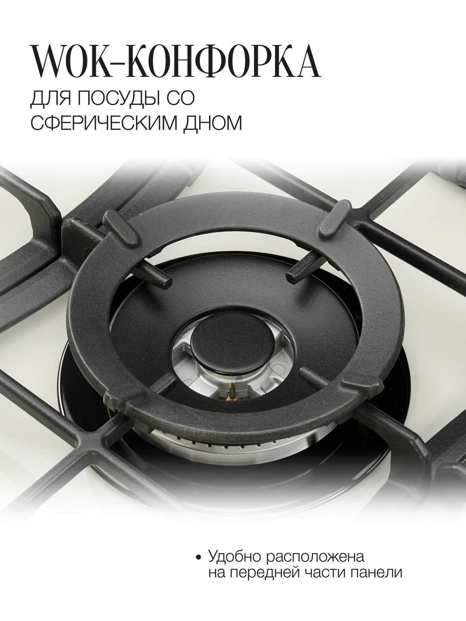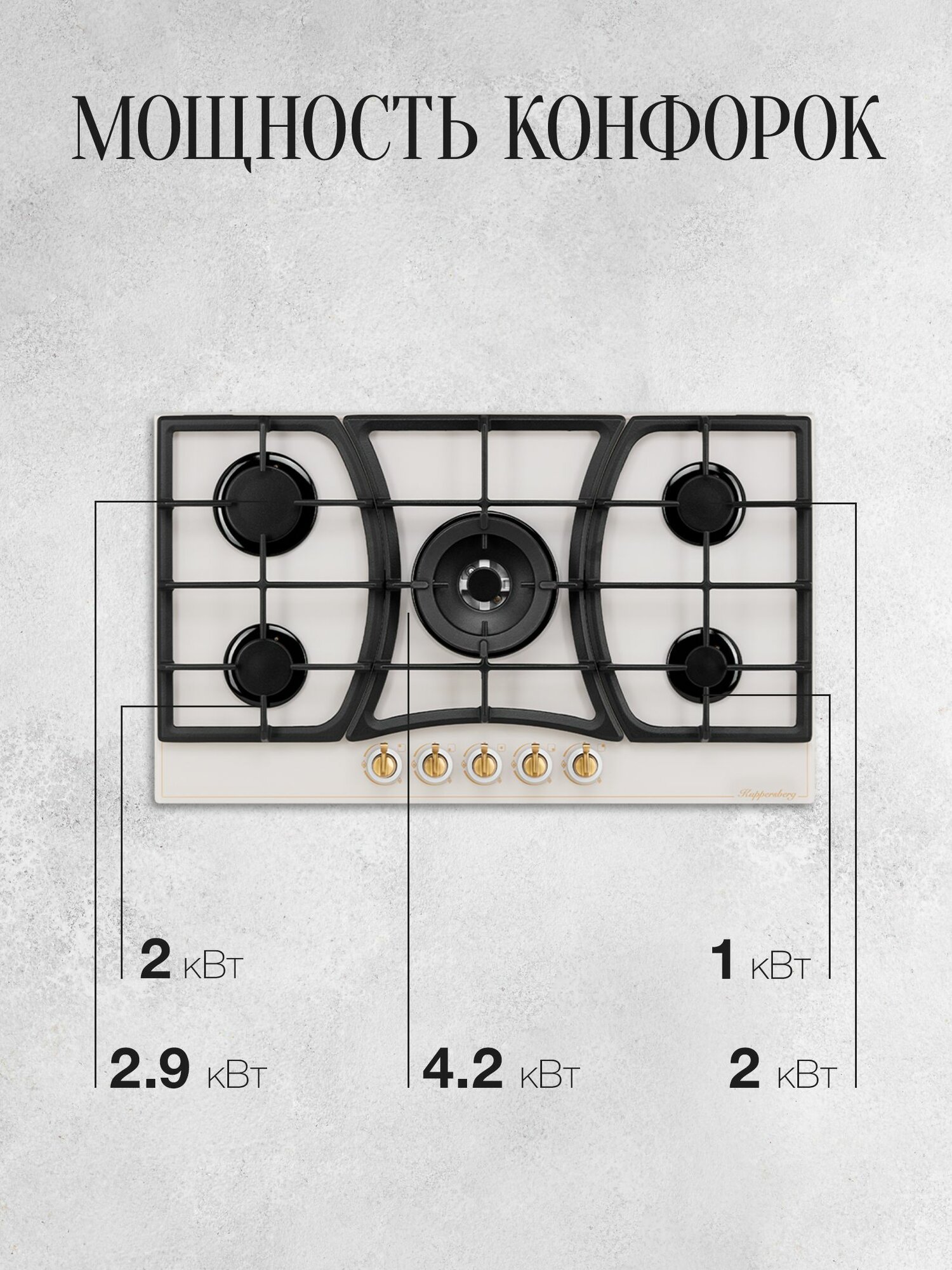 мощность конфорок, кВт: передняя левая - 2.0; мощность конфорок, кВт: передняя правая - 1,0; мощность конфорок, кВт: средняя - 4,2; мощность конфорок, кВт: задняя левая - 2,9; мощность конфорок, кВт: задняя правая - 2.0; форсунки под сжиженный газ - да