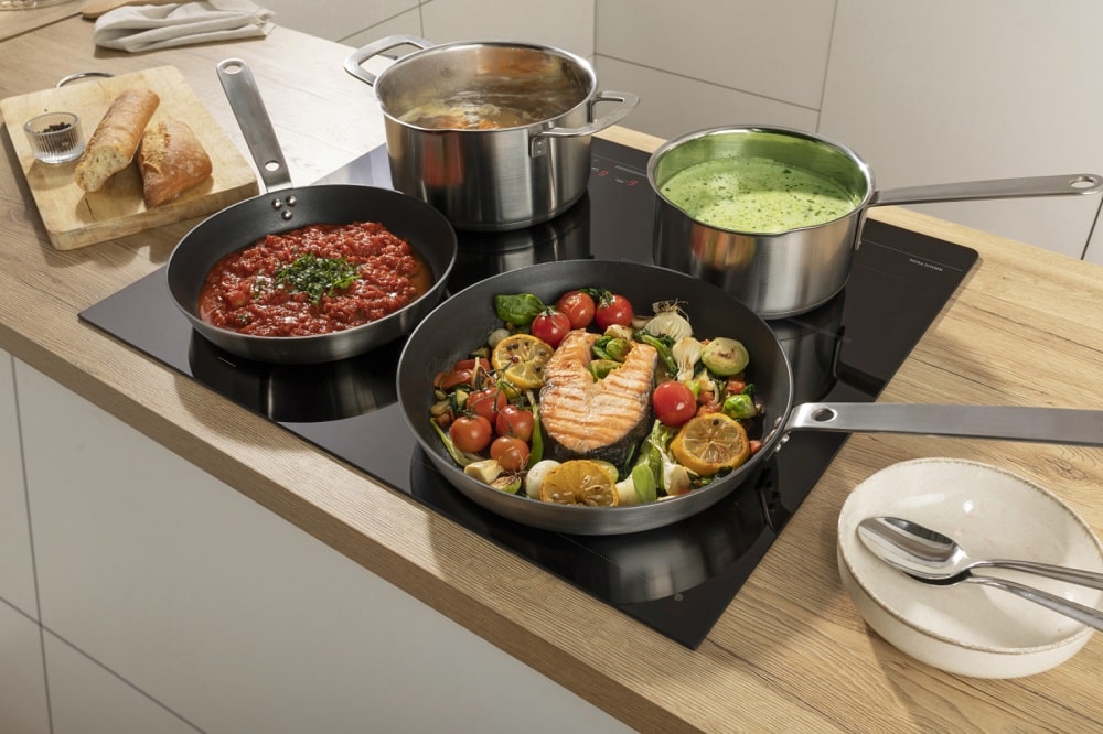 Induction FlexZone FlexZone Под каждой FlexZone находится 20овальных индукторов— ихболее чем достаточно для равномерного нагрева любого участка зоны. Врезультате повышение температуры происходит строго под дном установленной емкости.