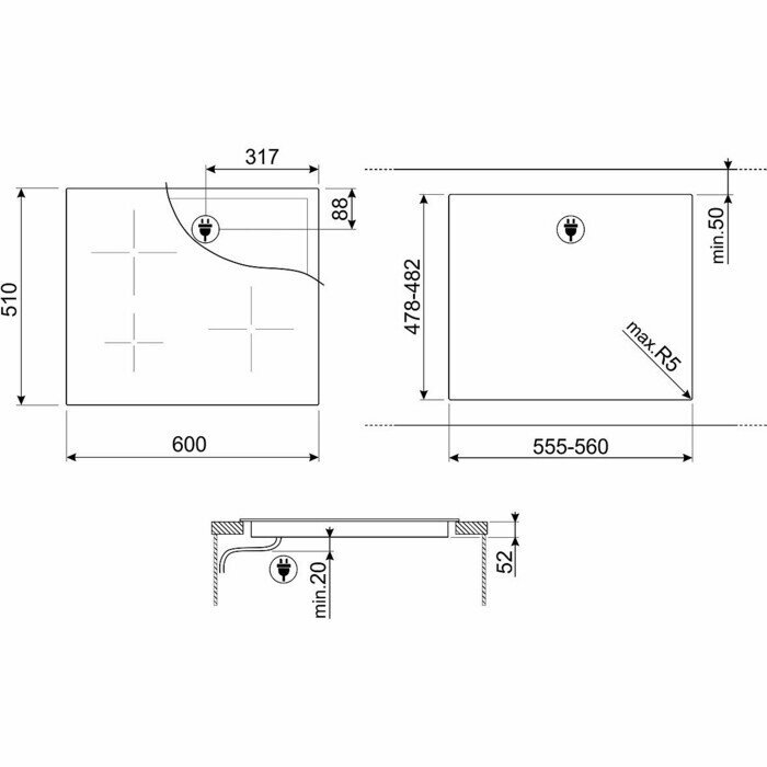 стандартный вырез: 478-482x555-560 мм; уровни мощности: 9; автоматическое определение диаметра посуды; автоматическое определение наличия посуды (минимум 9 см); индикация минимального диаметра посуды; длина электрического кабеля: 120 см