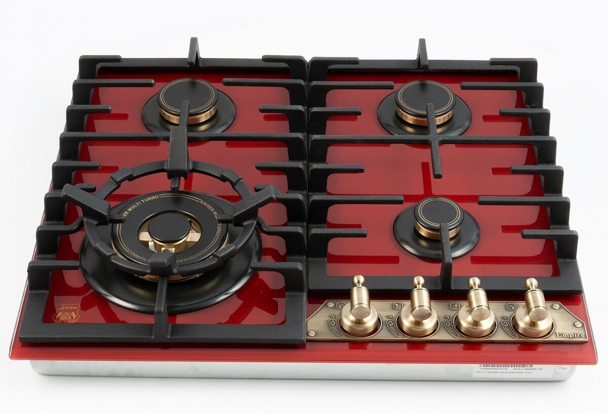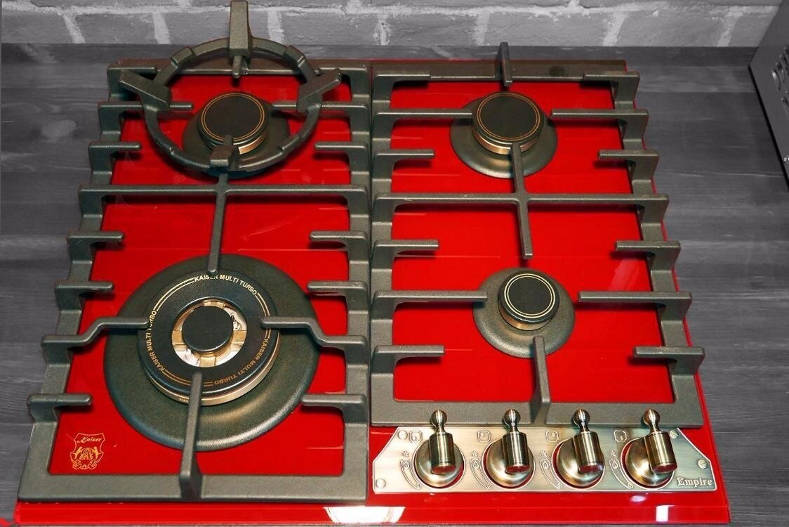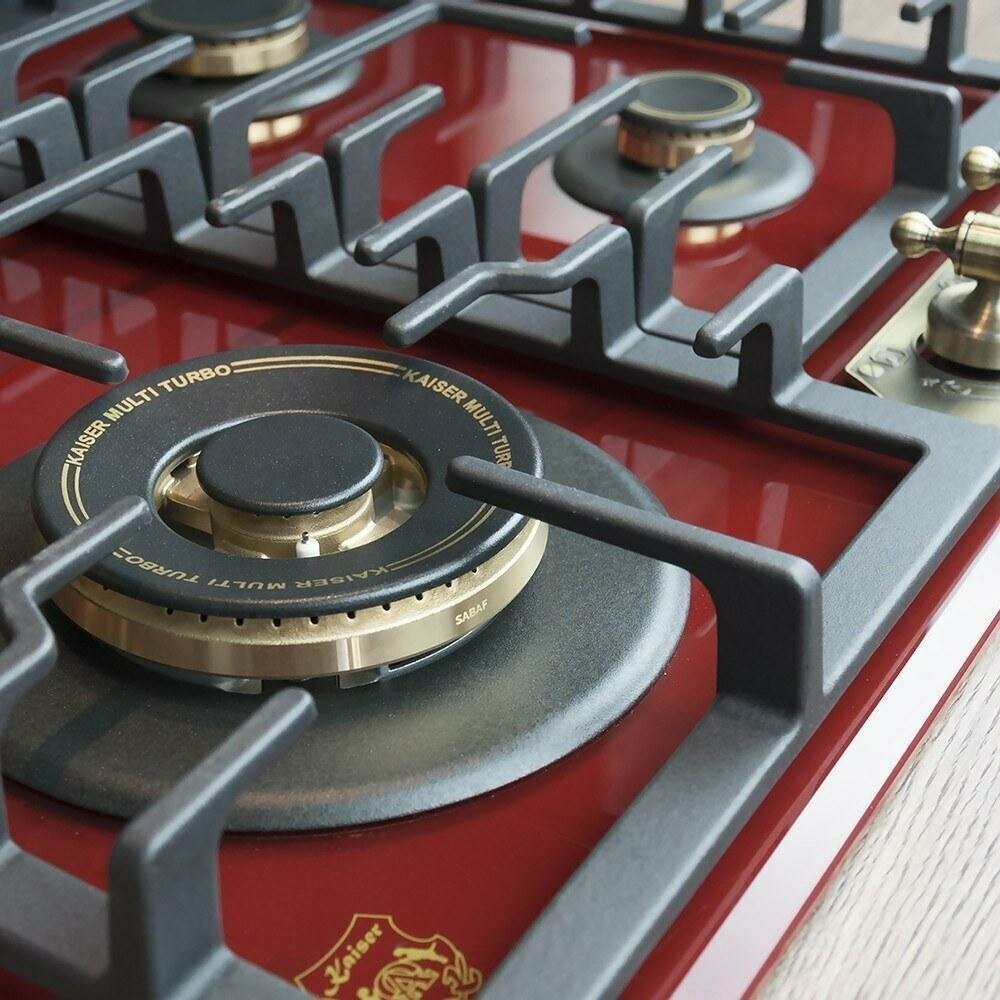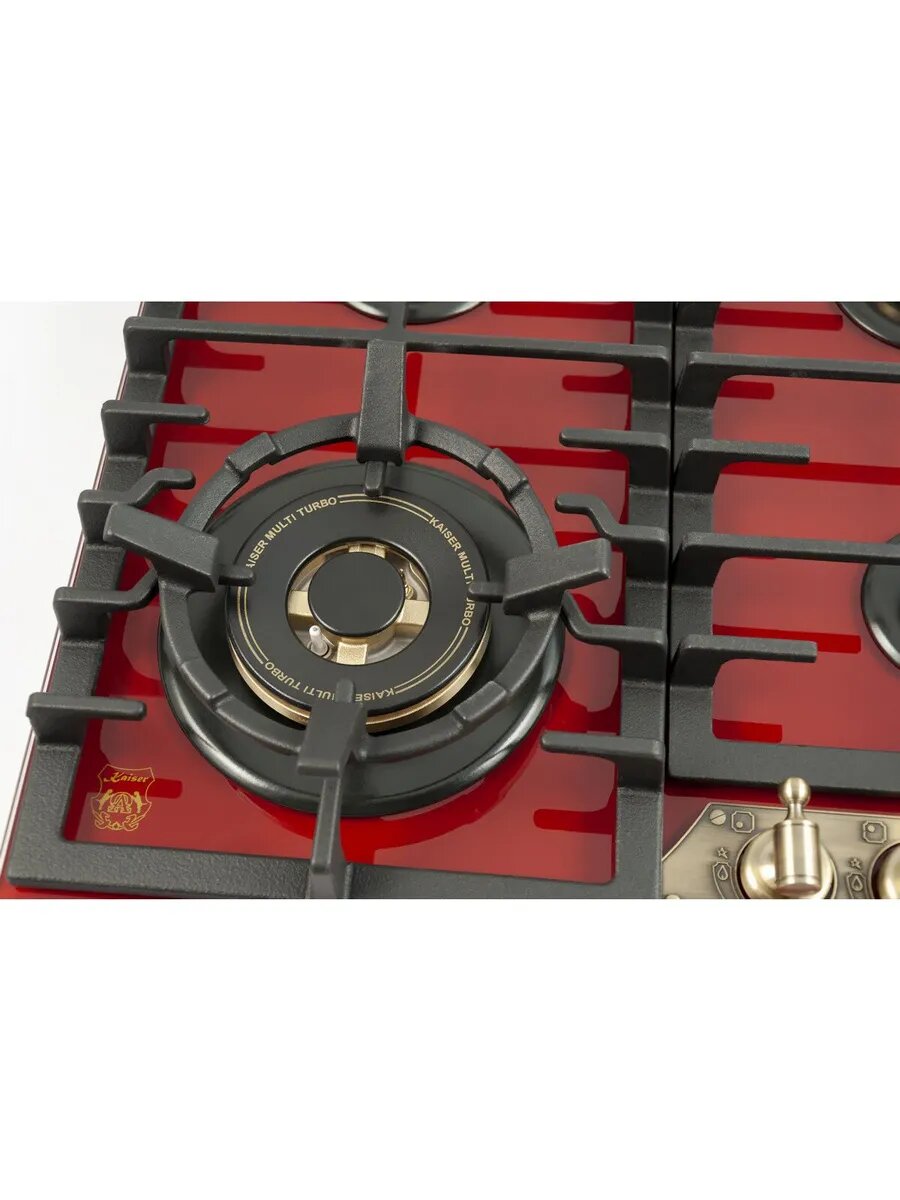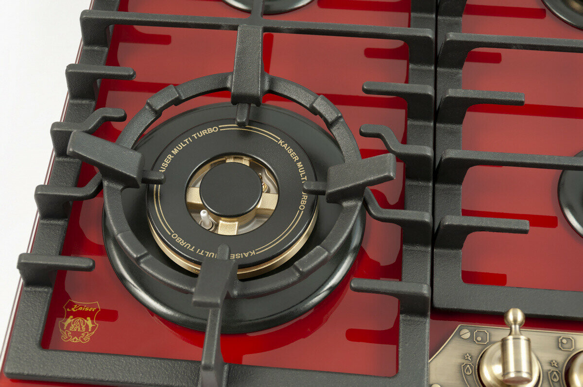 Газовая варочная панель Kaiser KCG 6335 RotEm Turbo из серии газ на стекле. Четыре конфорки с чугунными крышками украшены графикой. Одна из горелок - трехрядная турбоконфорка мощностью 3,8 кВт, одна экономичная и две стандартные. Сбоку - управления с четырьмя ручками «под бронзу».