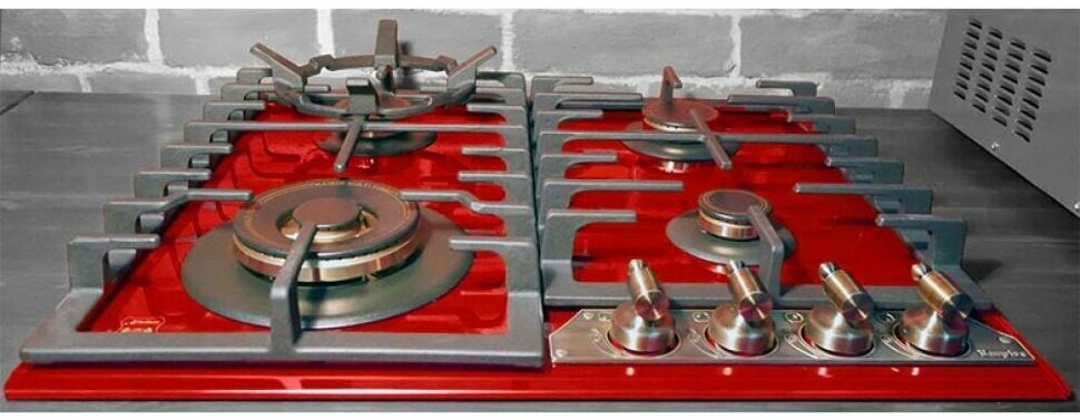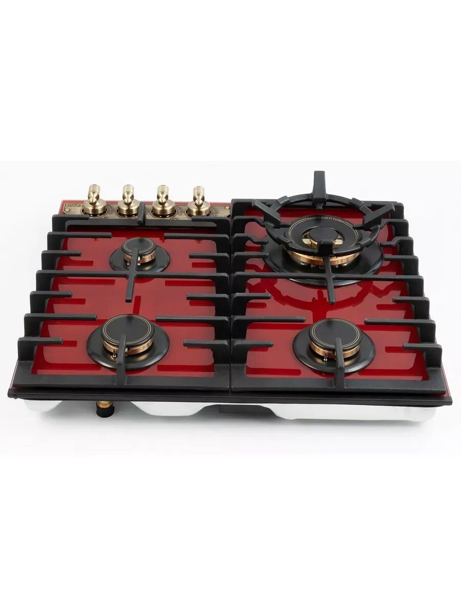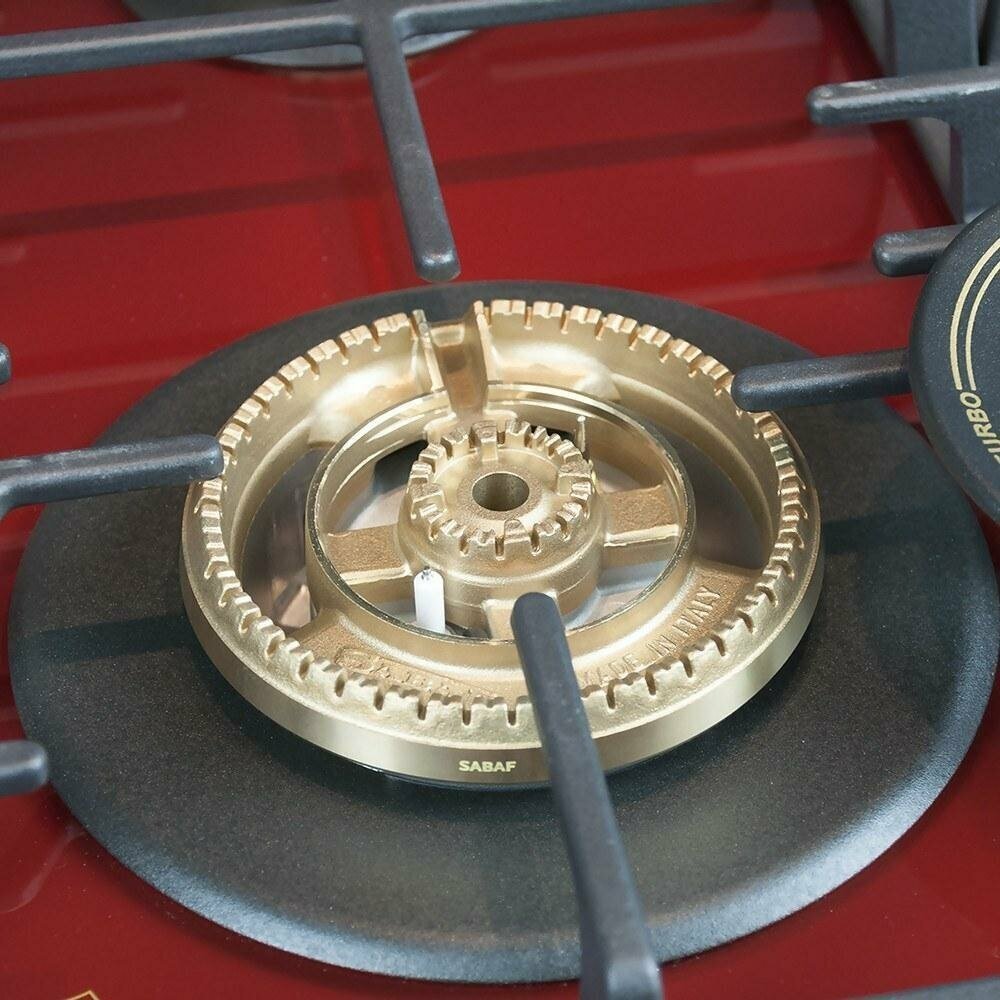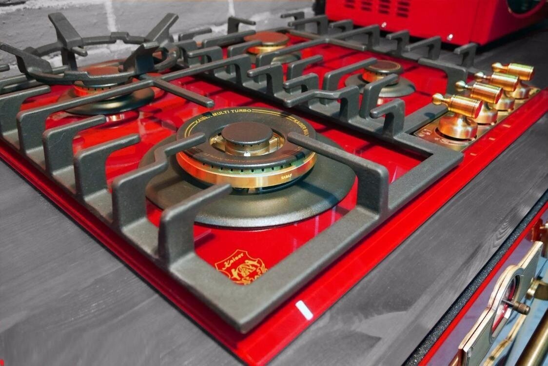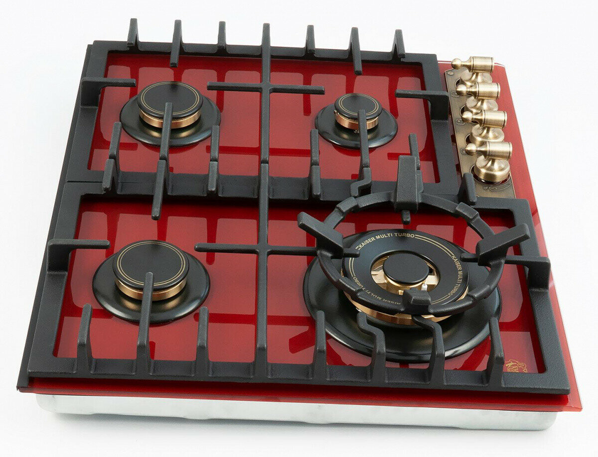 Газовая варочная панель Kaiser KCG 6335 RotEm Turbo из серии газ на стекле. Четыре конфорки с чугунными крышками украшены графикой. Одна из горелок - трехрядная турбоконфорка мощностью 3,8 кВт, одна экономичная и две стандартные. Сбоку - управления с четырьмя ручками «под бронзу».