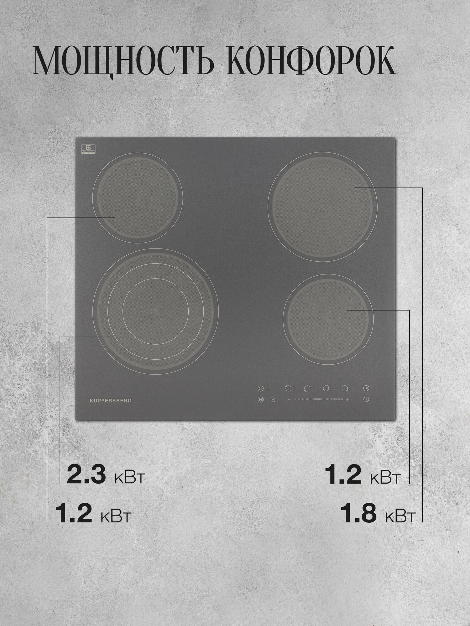мощность передней левой тройной конфорки: 0.7/1.8/2.3 кВт, мощность передней правой и задней левой конфорок: 1.2 кВт, мощность задней правой конфорки: 1.8 кВт; 9 уровней мощности
