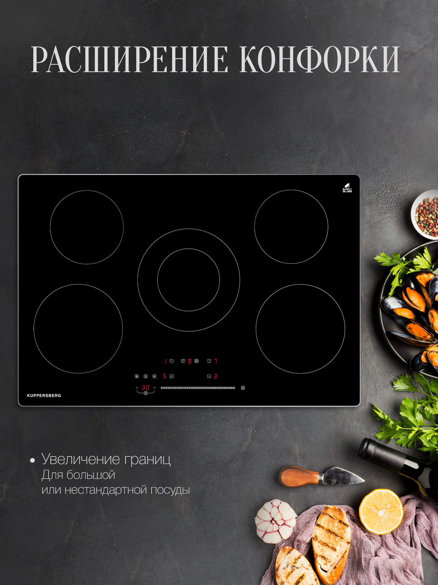 защитное отключение конфорок, индикатор остаточного тепла, кнопка блокировки панели