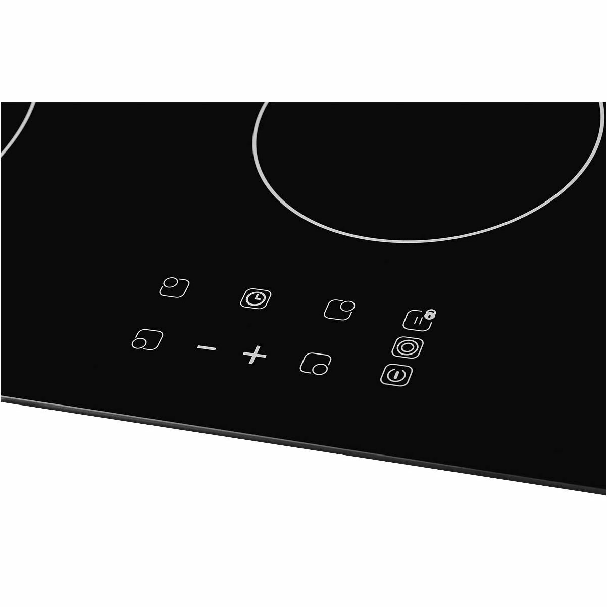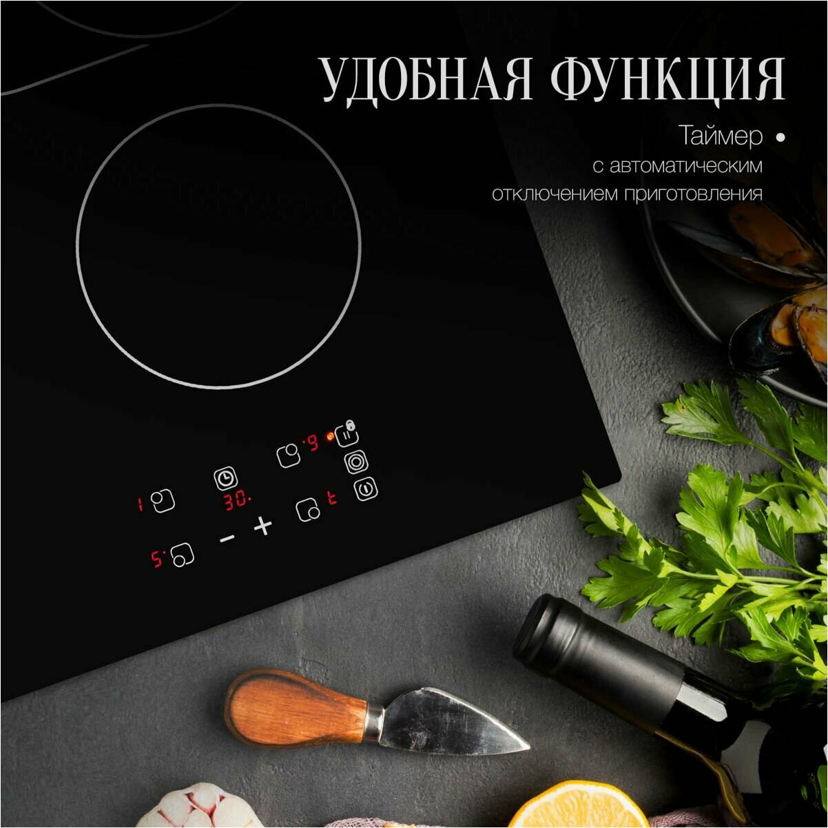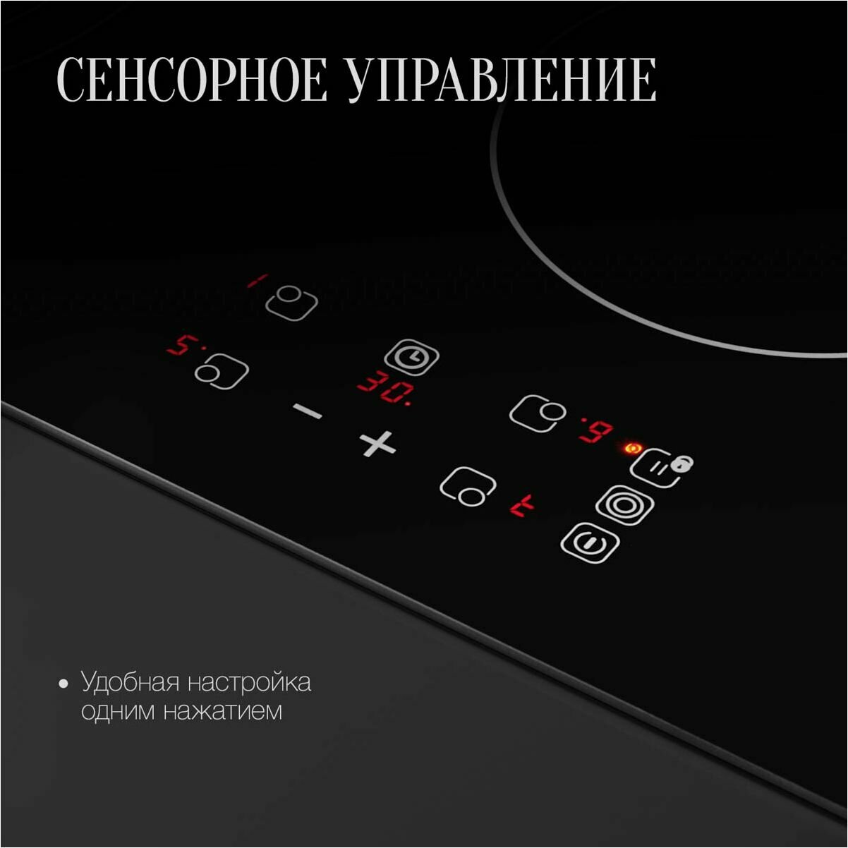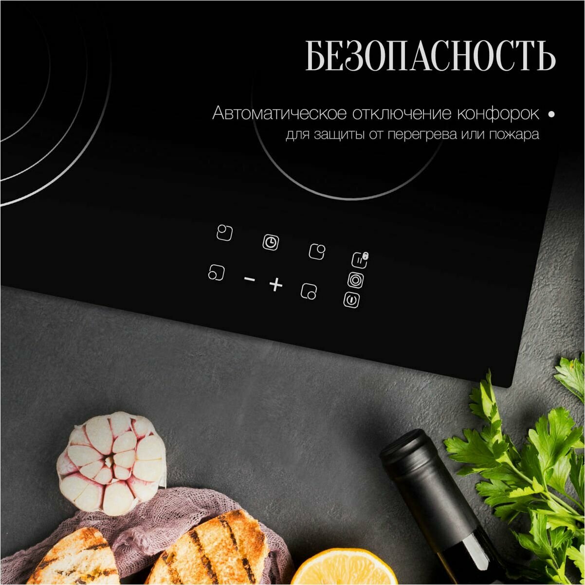 защитное отключение конфорок, индикатор остаточного тепла, кнопка блокировки панели