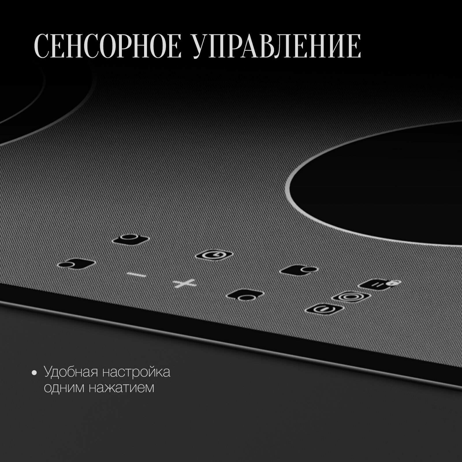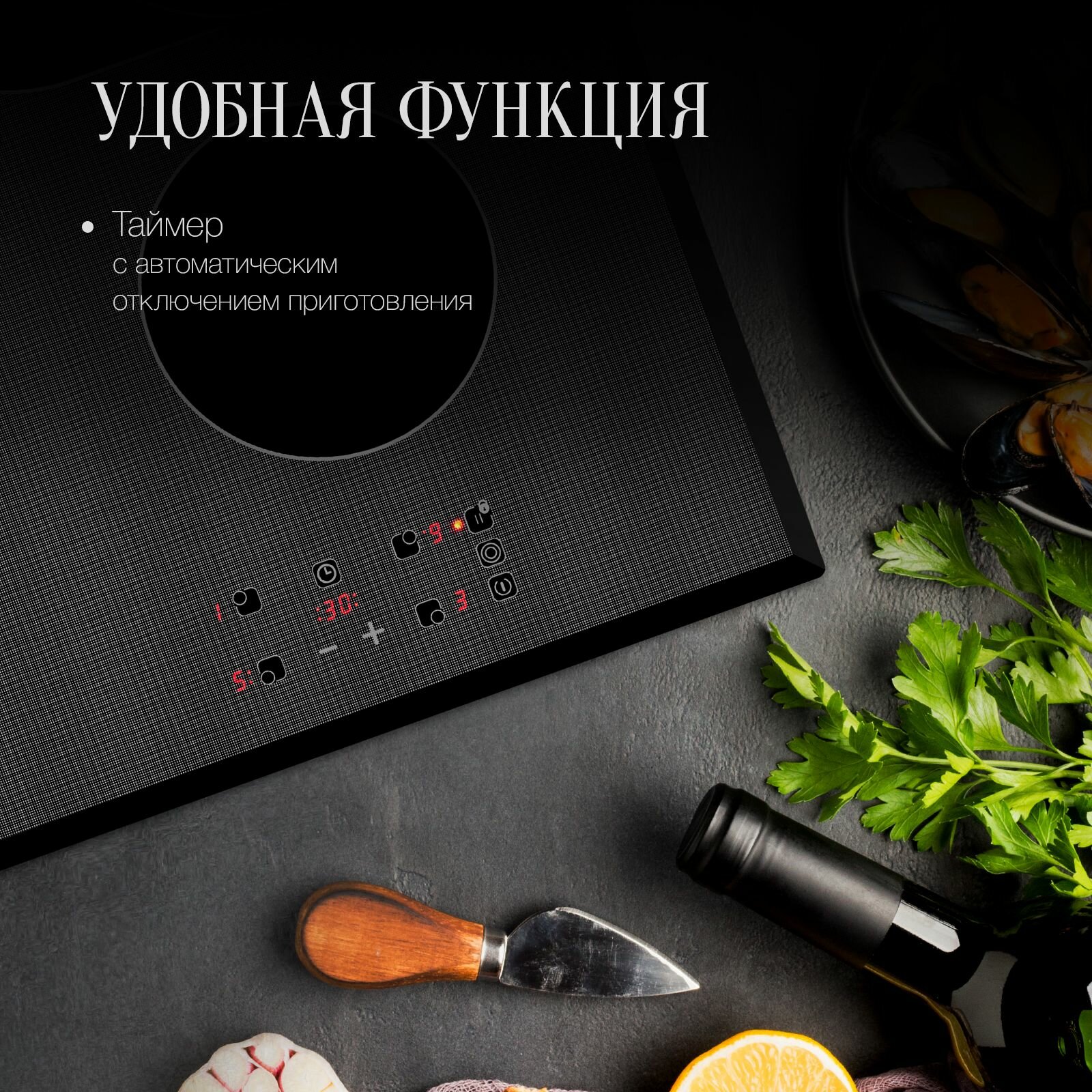 защитное отключение конфорок, индикатор остаточного тепла, кнопка блокировки панели