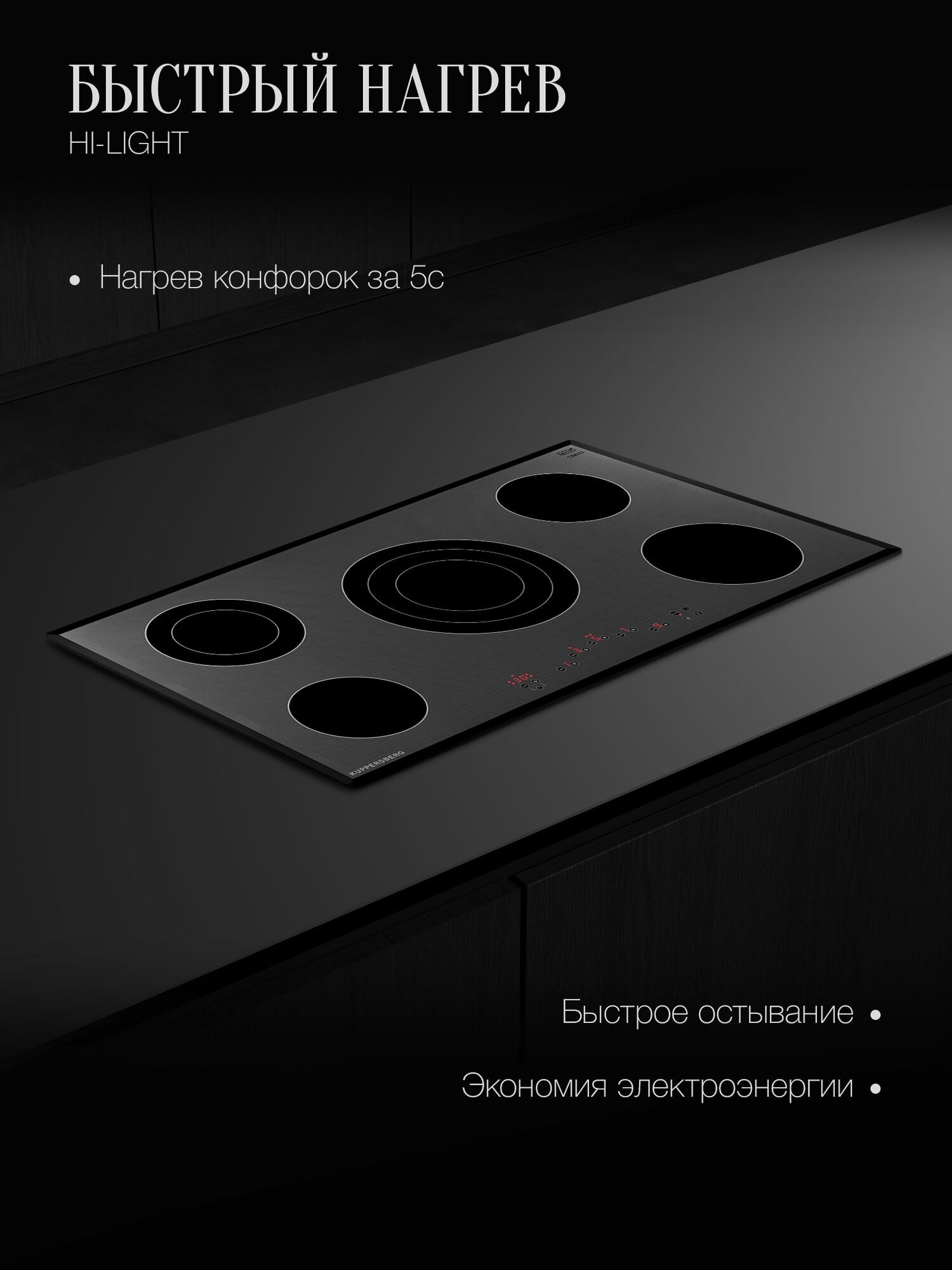 Hi-Light Hi-Light Традиционный способ нагрева сначала конфорки, затем посуды. Вольфрамовая лента разогревается донужной температуры, передает тепло стеклокерамической поверхности, аона— кастрюле. Отличия отобычных электрических конфорок вболее быстром нагреве иэкономичном энергопотреблении.