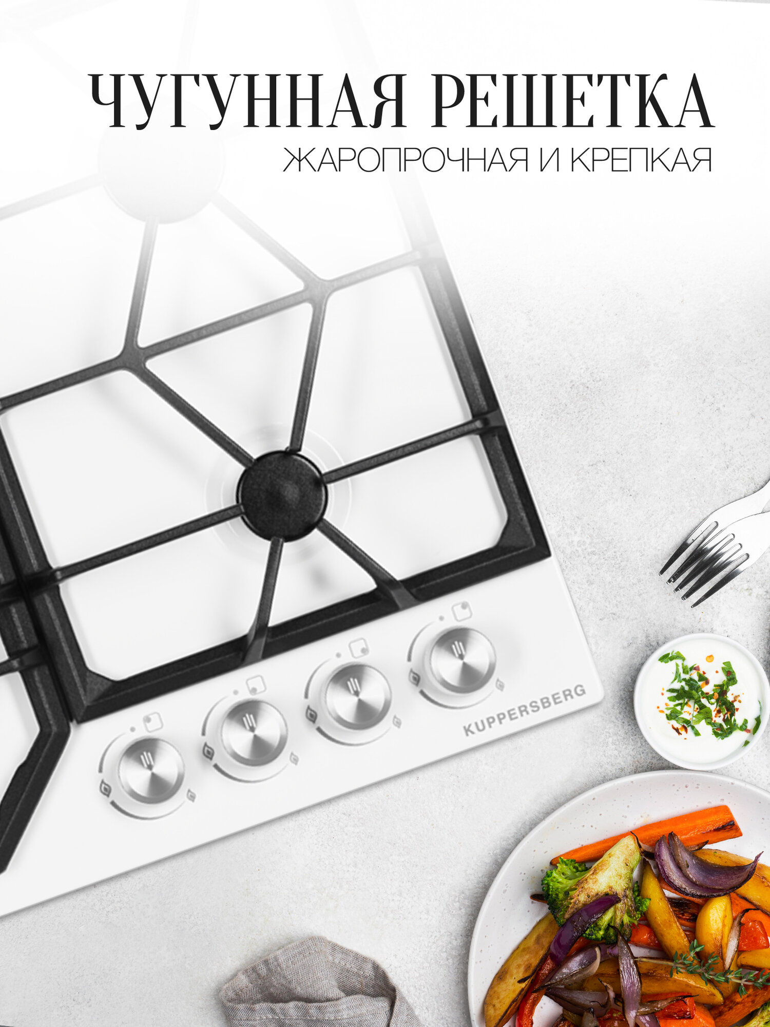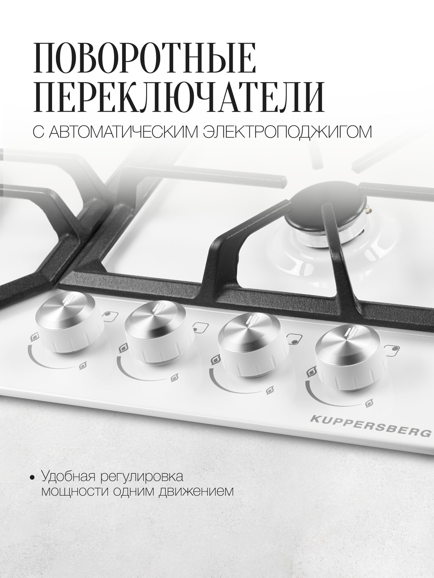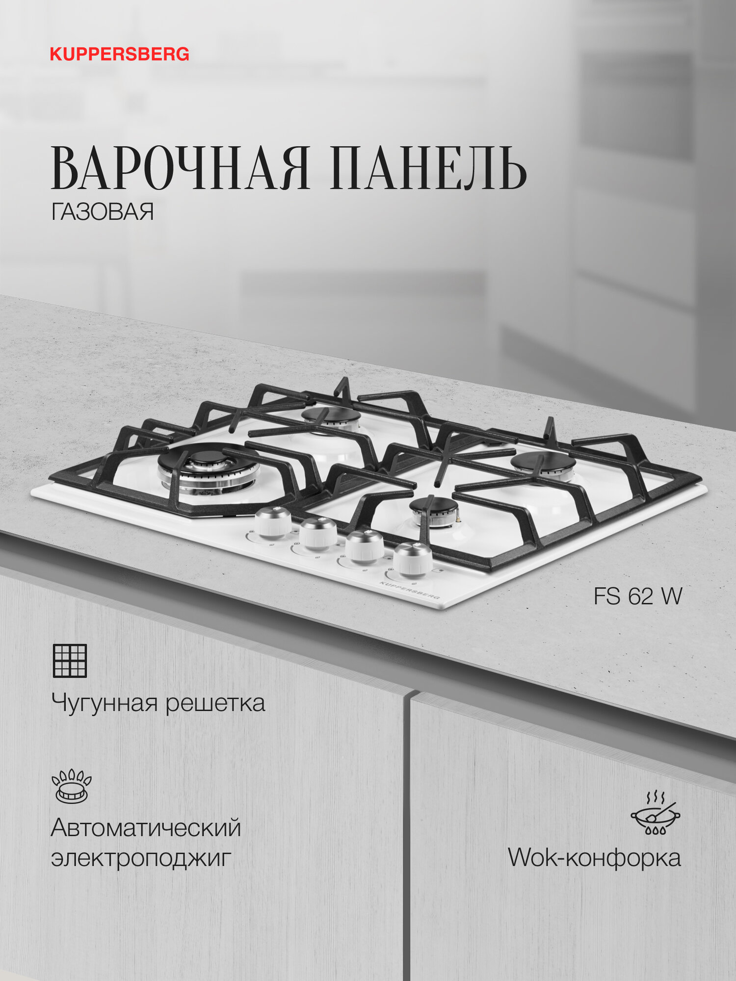 чугунные решетки, газ-контроль, конфорка WOK, электроподжиг в поворотной ручке