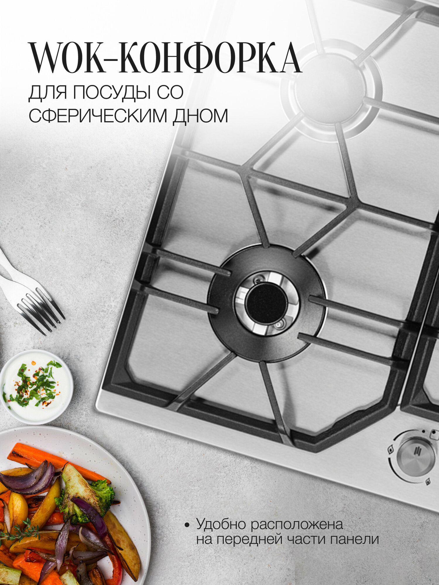 чугунные решетки, газ-контроль, конфорка WOK, электроподжиг в поворотной ручке