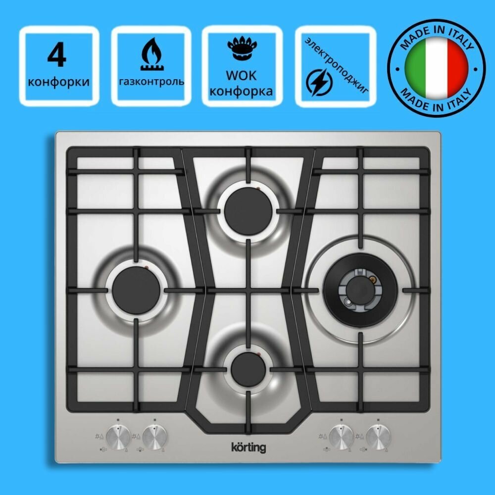 чугунные решетки, газ-контроль, дополнительные форсунки в комплекте, конфорка WOK, электроподжиг в поворотной ручке, электроподжиг в ручке (автоматический)