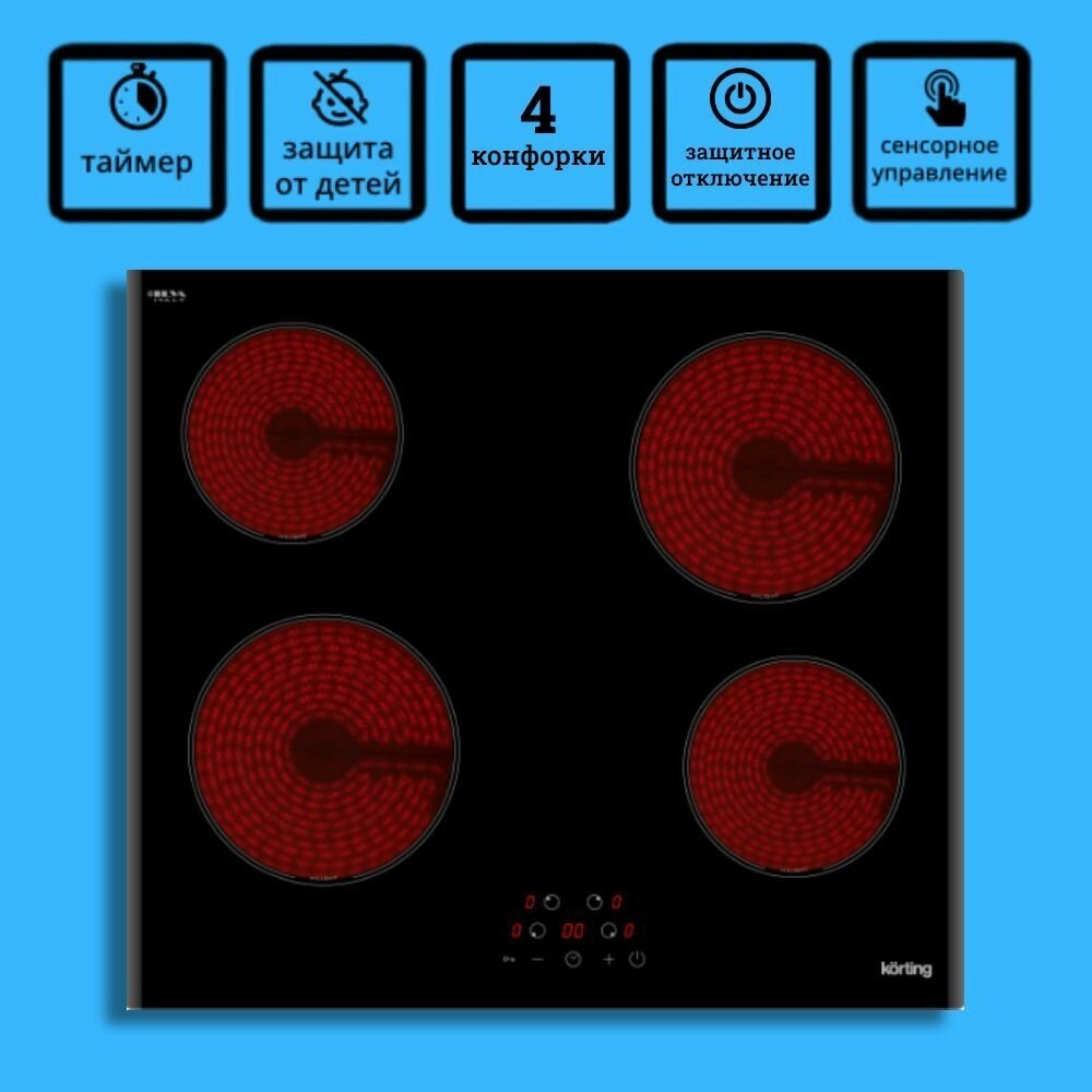 Электрическая варочная поверхность Korting HK 60003 B- представлен в элегантном черном дизайне с 4 конфорками. Независимо установленный прибор работает на 6 кВт при подключении с помощью 5-жильного кабеля.
