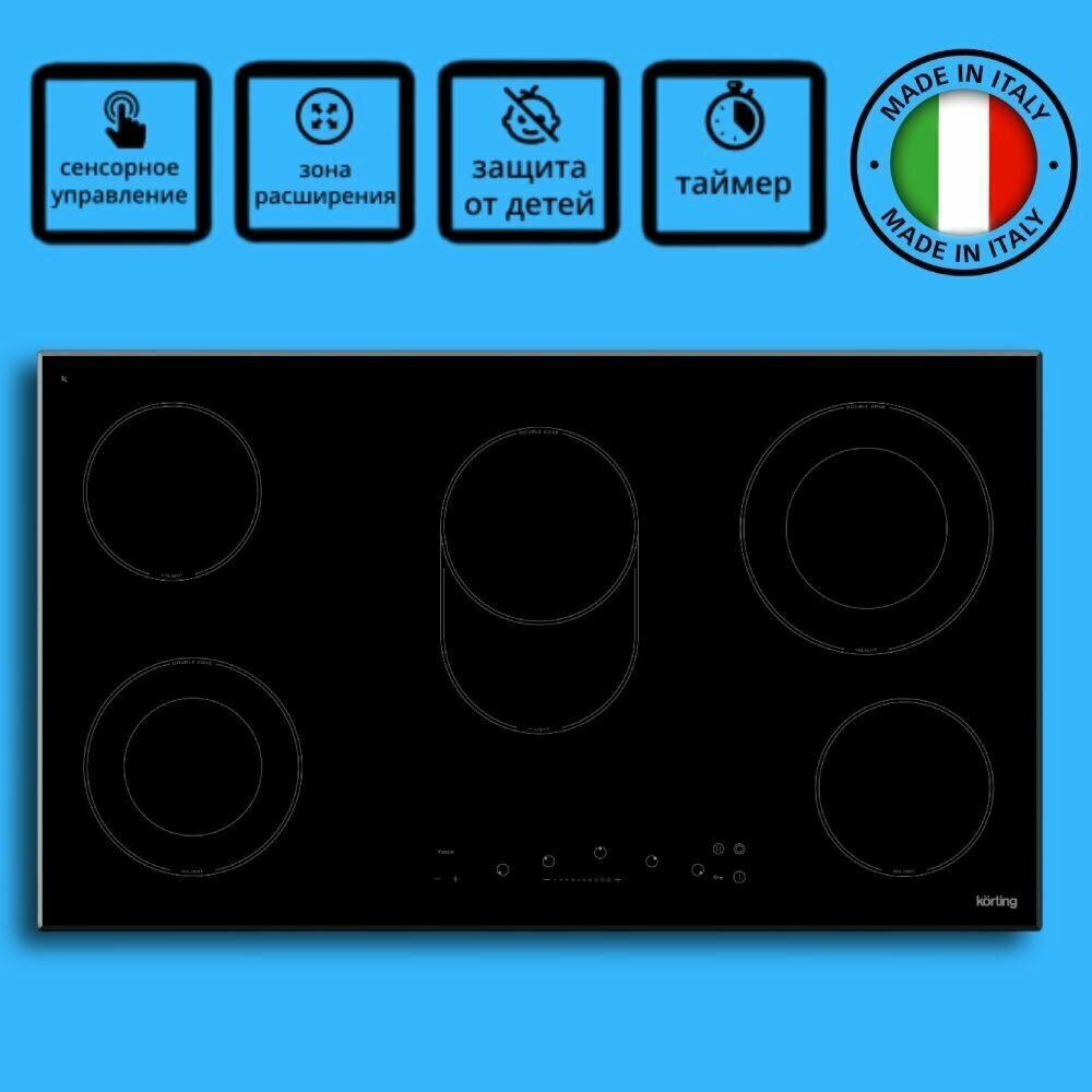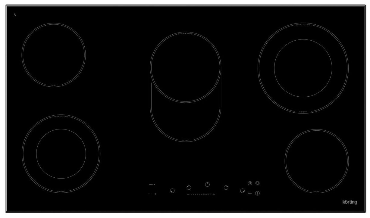 Электрическая варочная поверхность Korting HK 93551 B - две конфорки имеют два контура, а одна имеет овальную зону нагрева. Для выбора конфорки и ее мощности нагрева (9 уровней) используйте сенсорные кнопки. Индикаторы остаточного тепла на всех конфорках позволяют готовить пищу на уже выключенной рабочей поверхности, тем самым экономя электроэнергию.