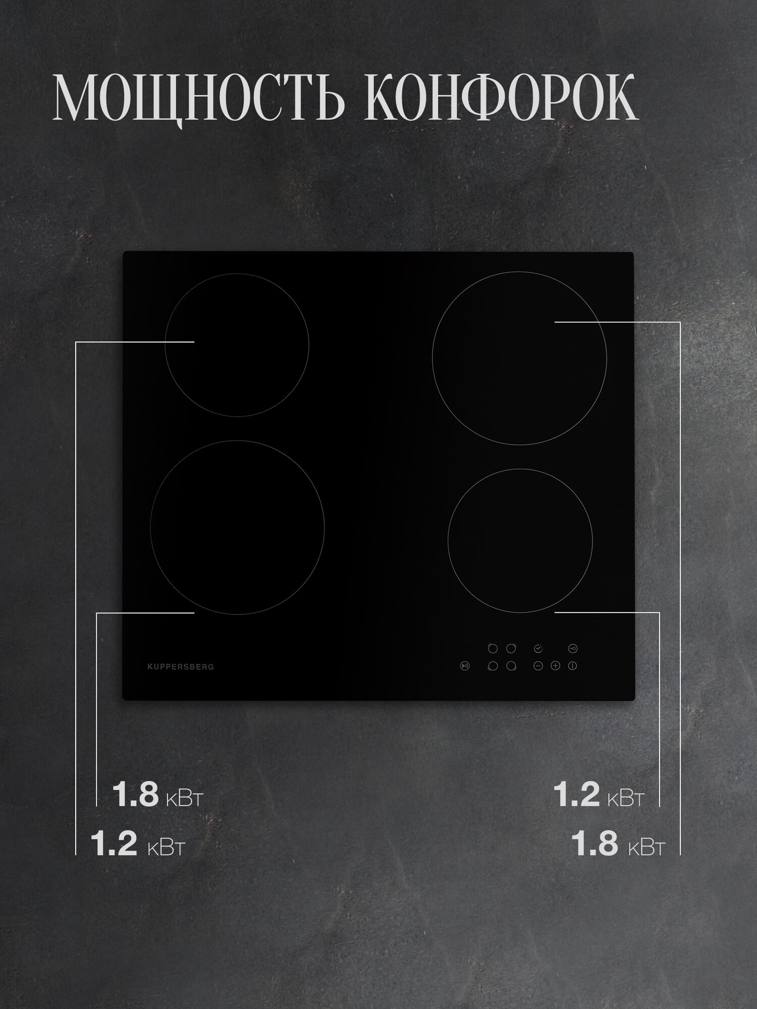 мощность передней левой и задней правой конфорок: 1.8 кВт, мощность передней правой и задней левой конфорок: 1.2 кВт