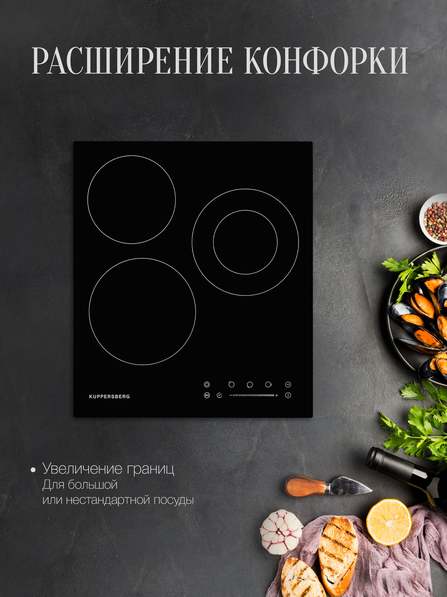 Ключевые преимущества: двухконтурная конфорка, пауза Stop & Go, защита от детей.
