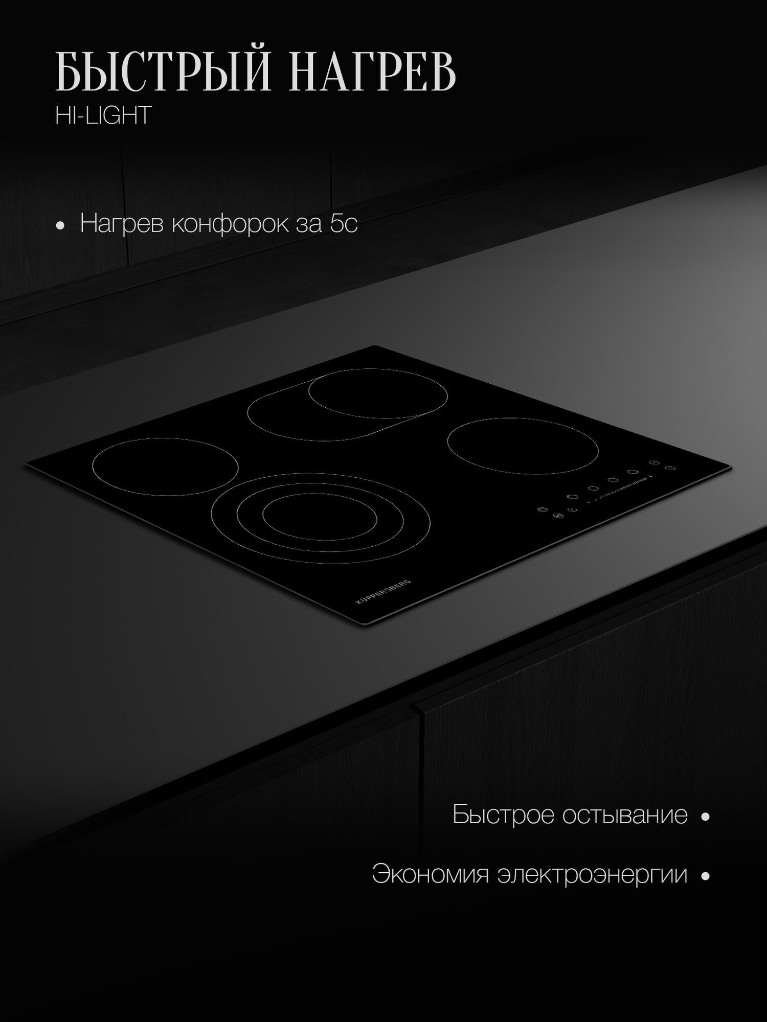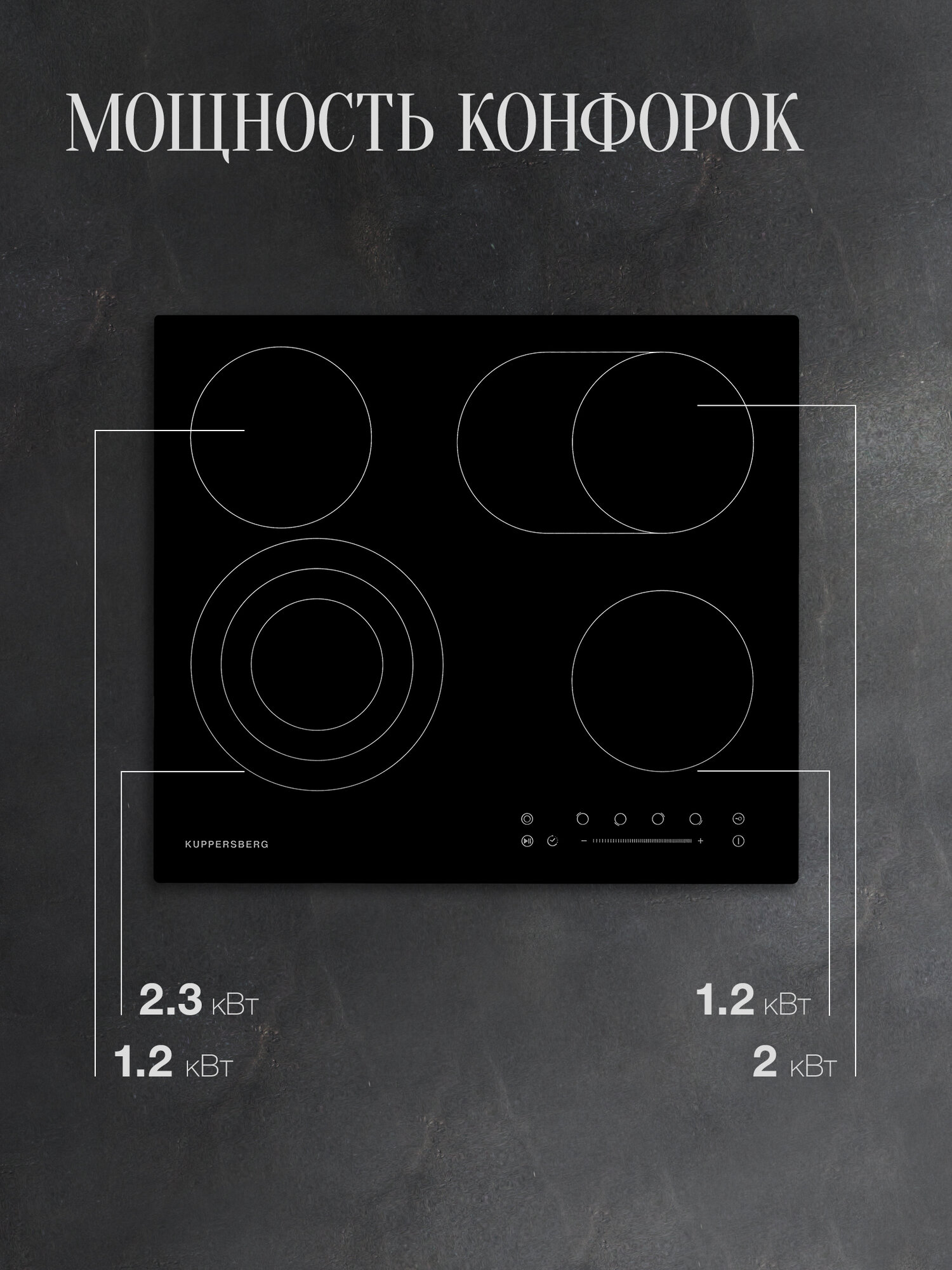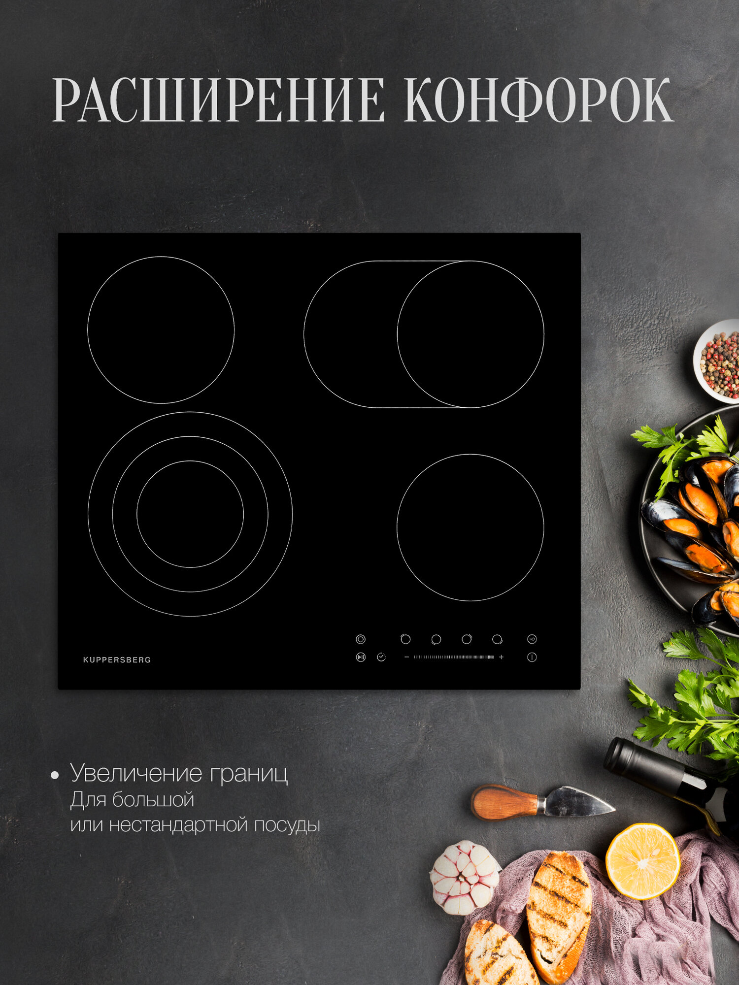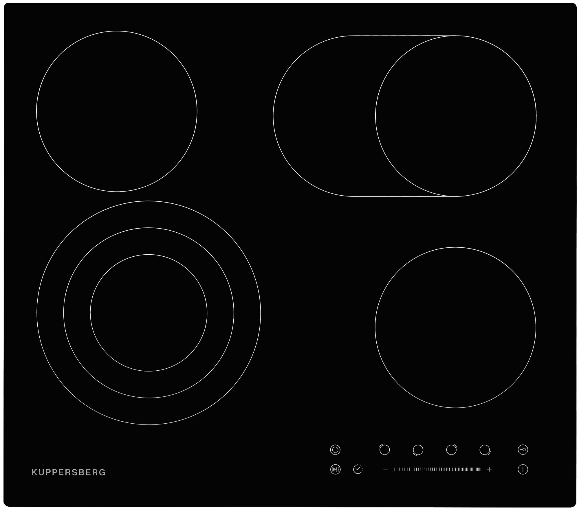 Варочная панель Kuppersberg ECS 623 включает в себя 4 конфорки Hi-Light, одна из которых трехконтурная и одна овальная, что расширяет ваши кулинарные возможности, позволяя использовать блюда нестандартных размеров, например, утят. С помощью удобного сенсорного управления можно легко и удобно настроить рабочие параметры устройства.