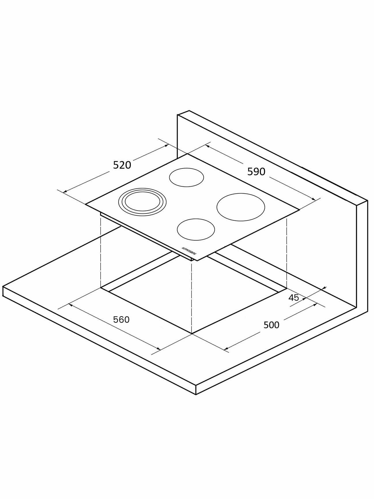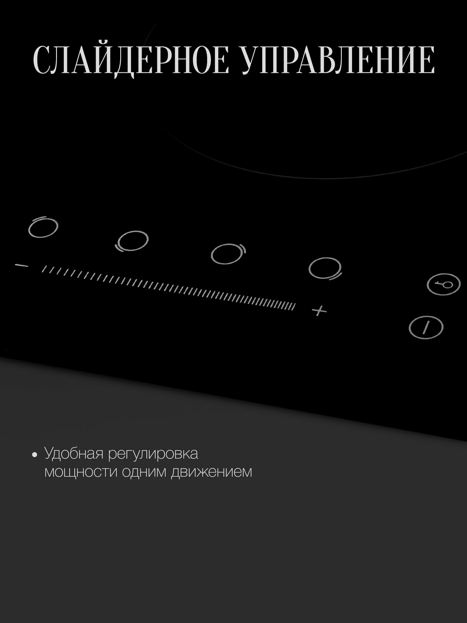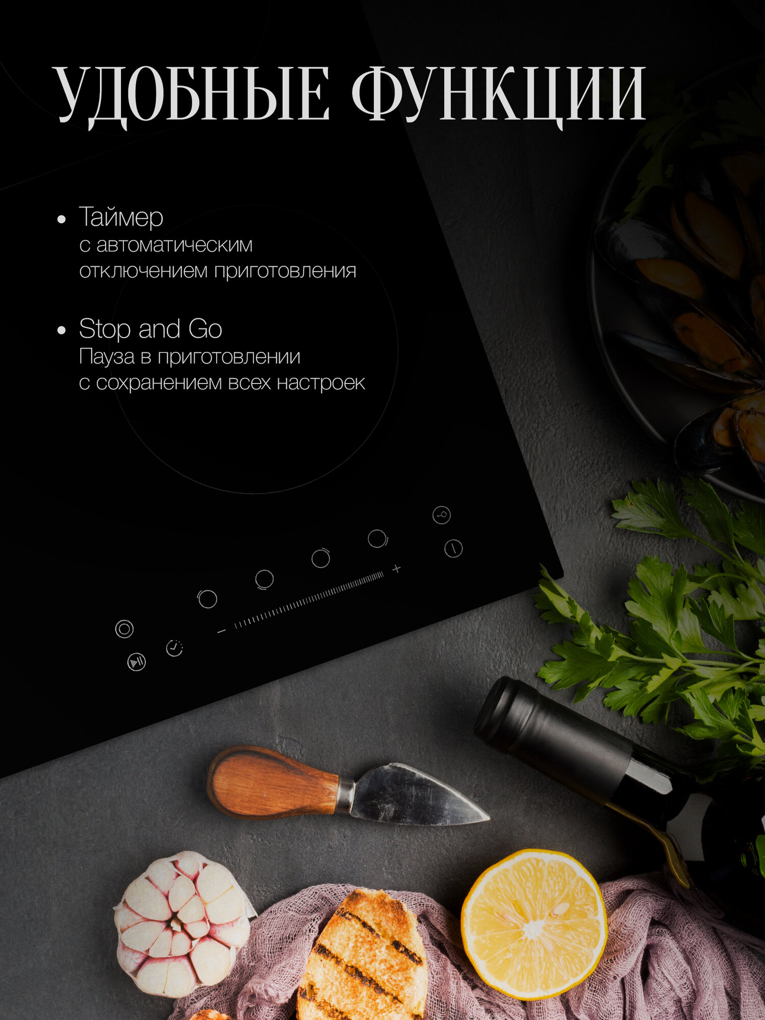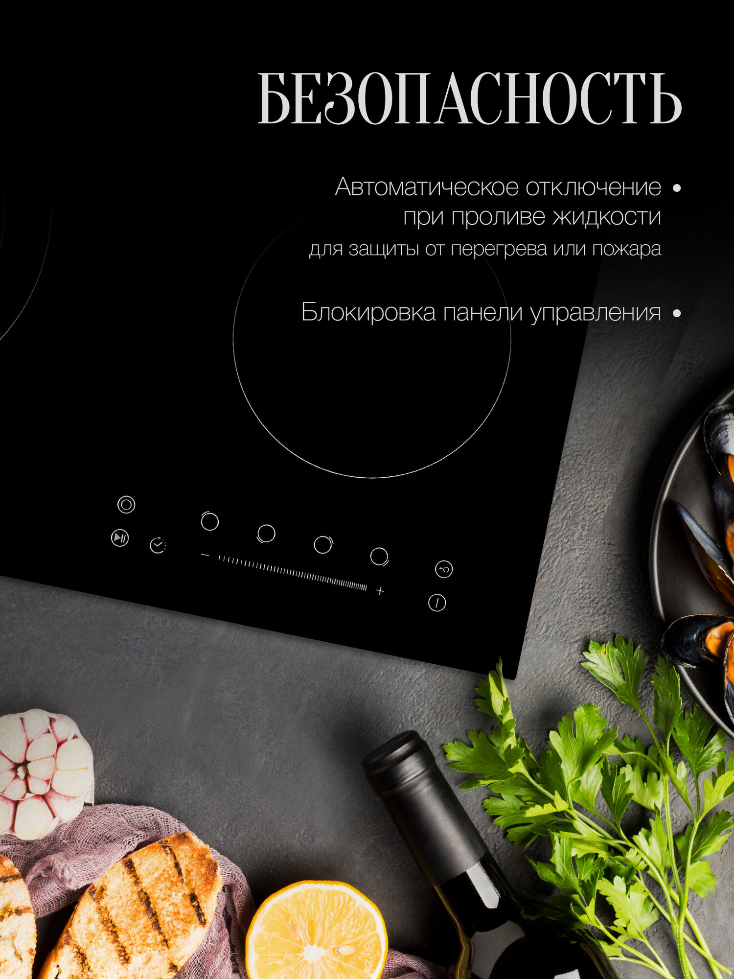 Электронное управление; Самодиагностика неисправности; Функция Stop&Go; Расширенная зона на 2 конфорки; Цифровой дисплей; Отключение при проливе жидкости; Блокировка от детей; Индикация выбранной мощности; В комплекте: сетевой кабель без вилки