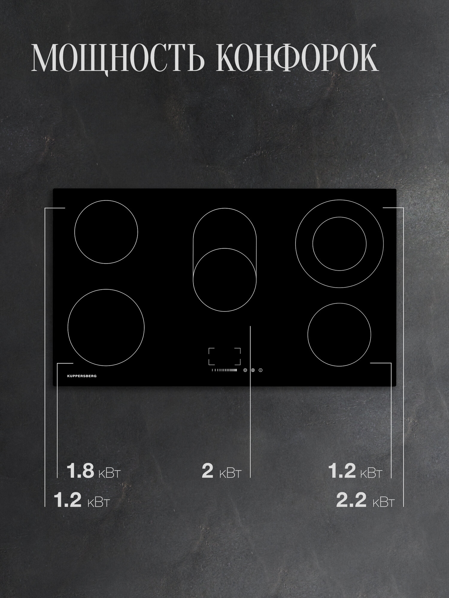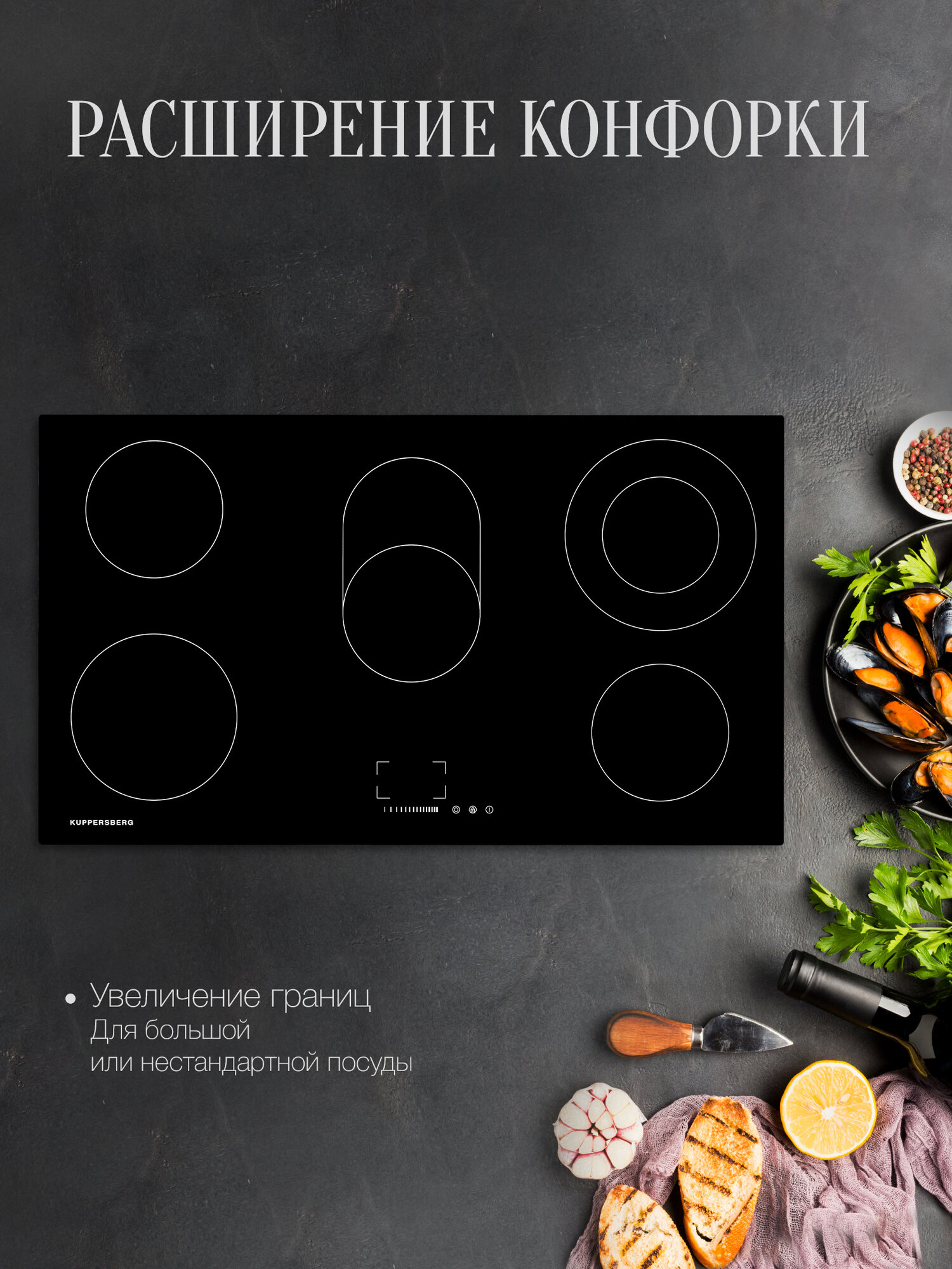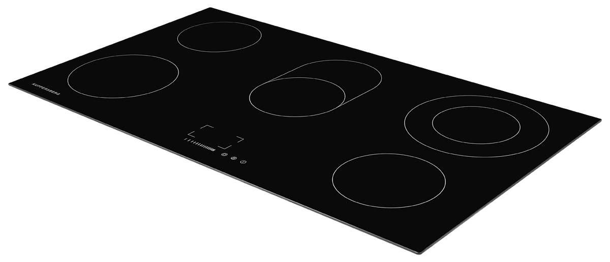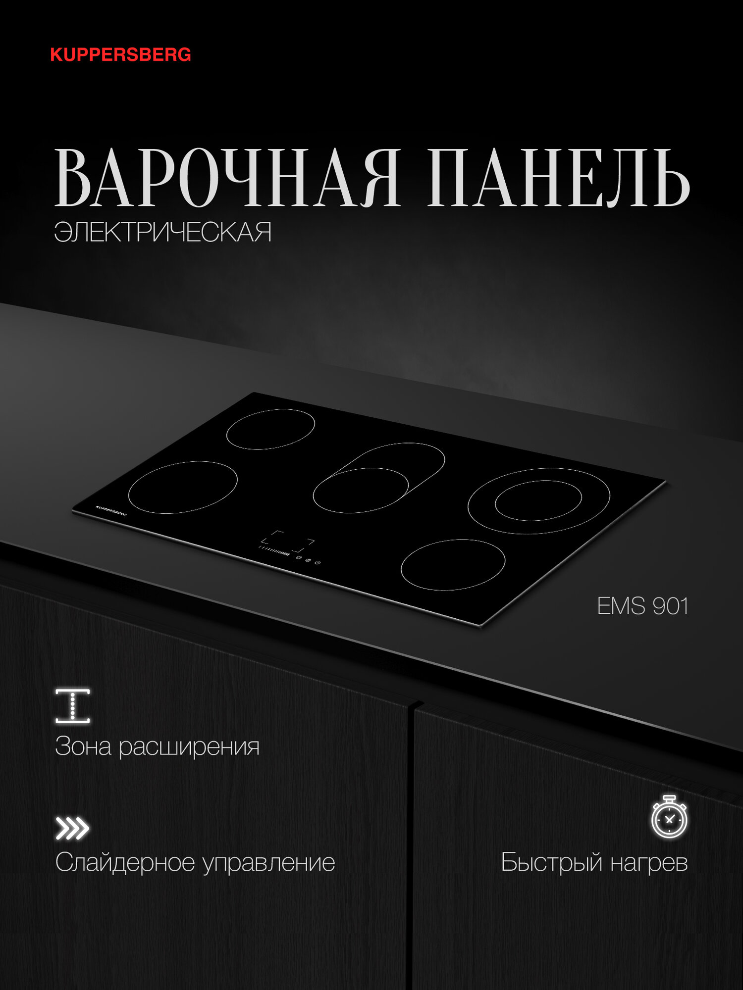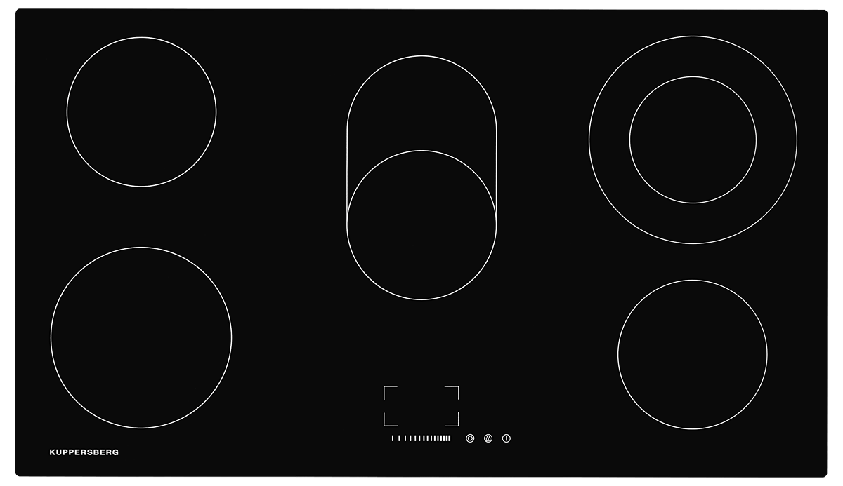 Варочная поверхность Kuppersberg EMS 901 оснащена 5 конфорками. Два из них имеют зону расширения: овальную и двухконтурную. Управление удобно и просто, осуществляется с помощью сенсорной панели.