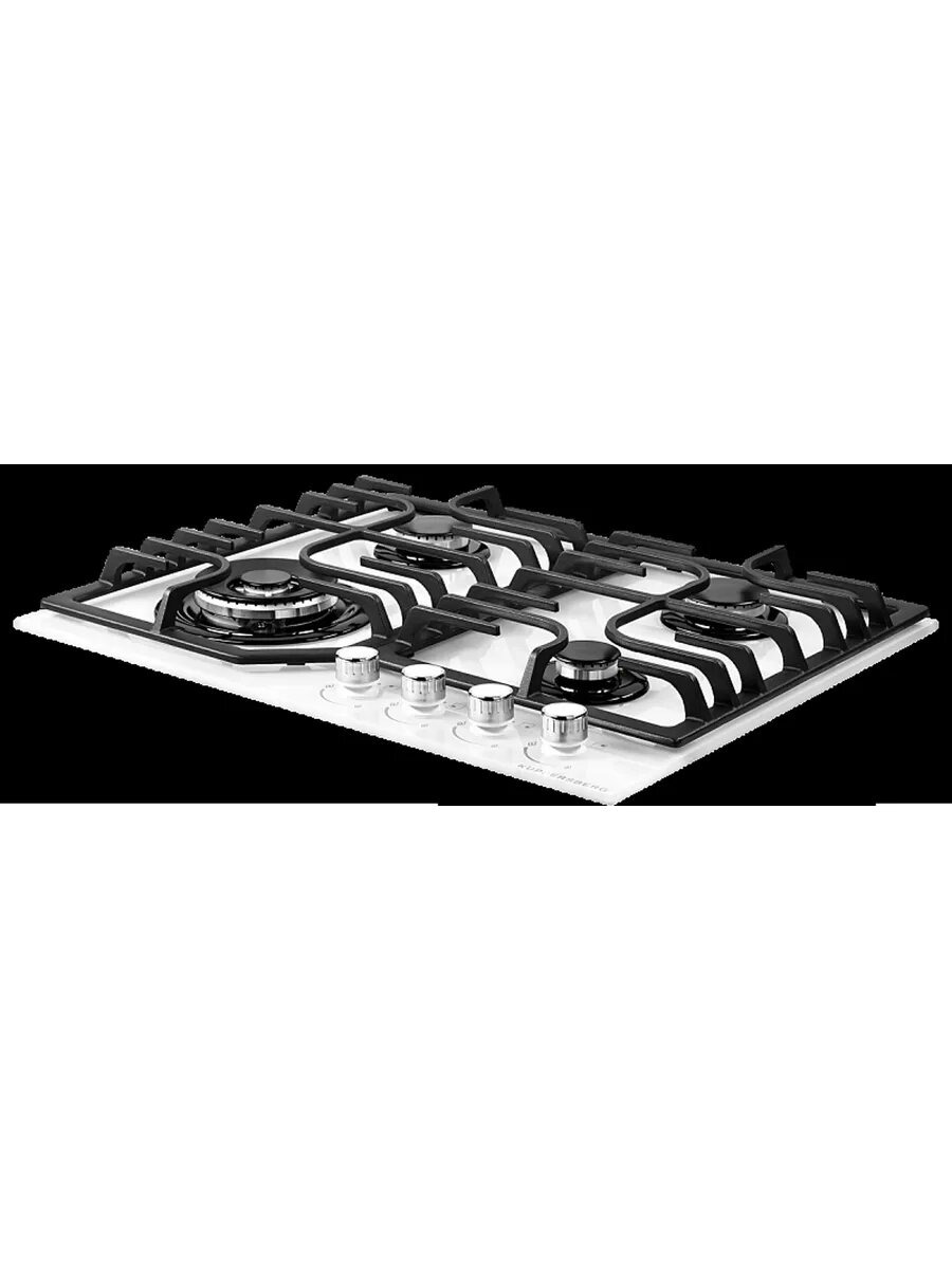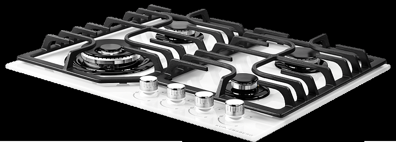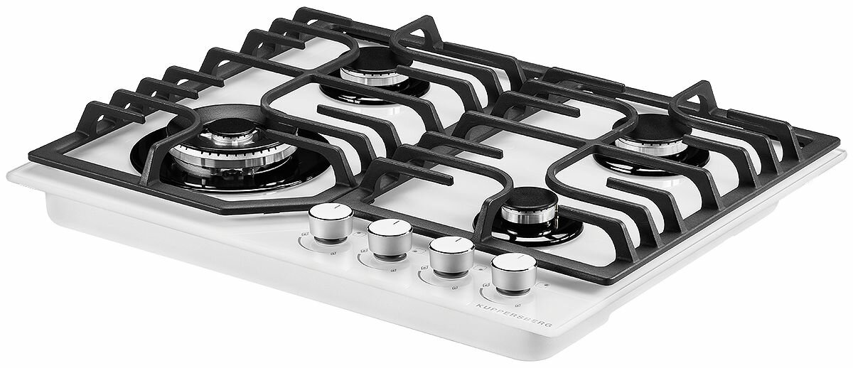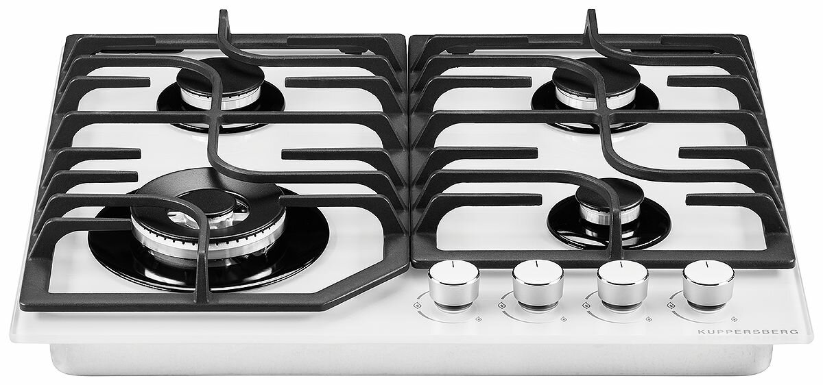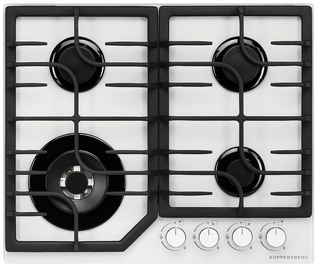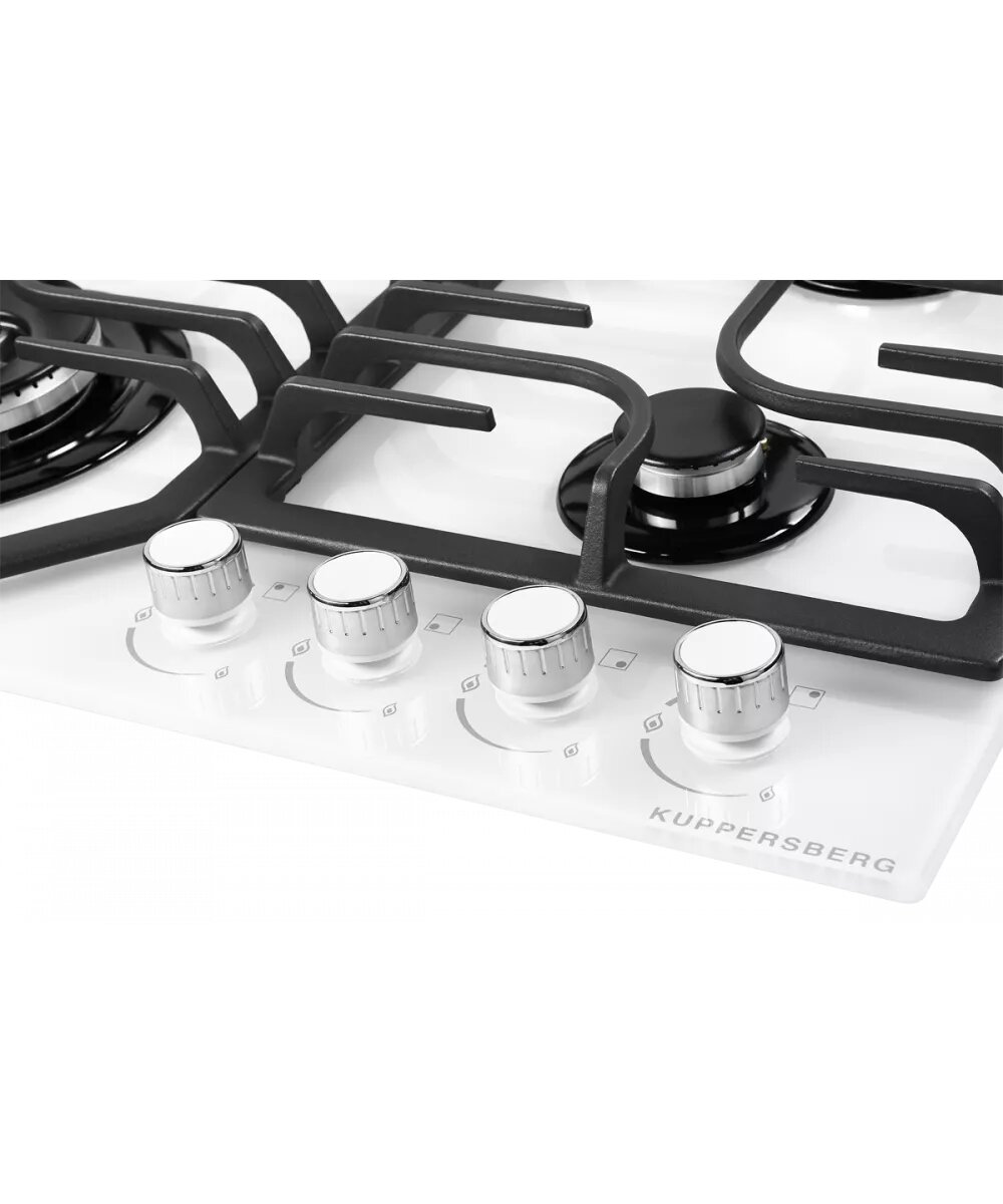Газовая плита Kuppersberg FG 63 W из белоснежного закаленного стекла для современной кухни. Модель оборудована четырьмя конфорками, в том числе зоной WOK, и чугунными опорами. Управление осуществляется поворотными регуляторами.