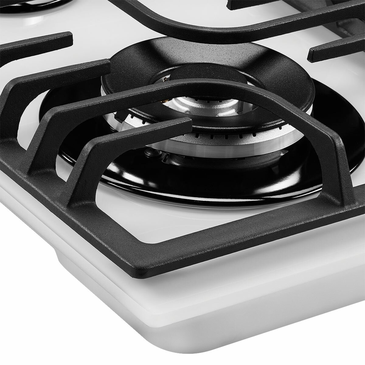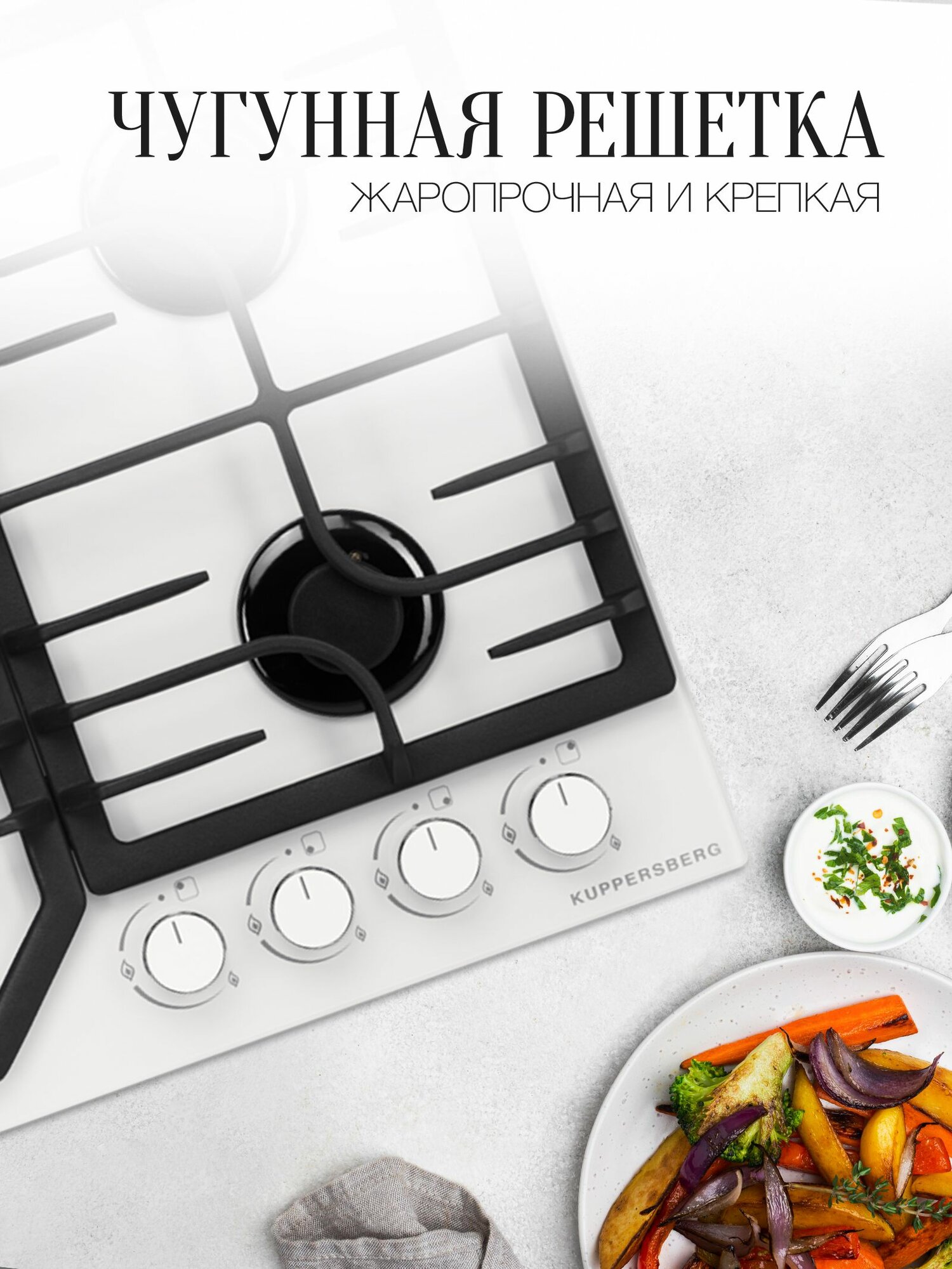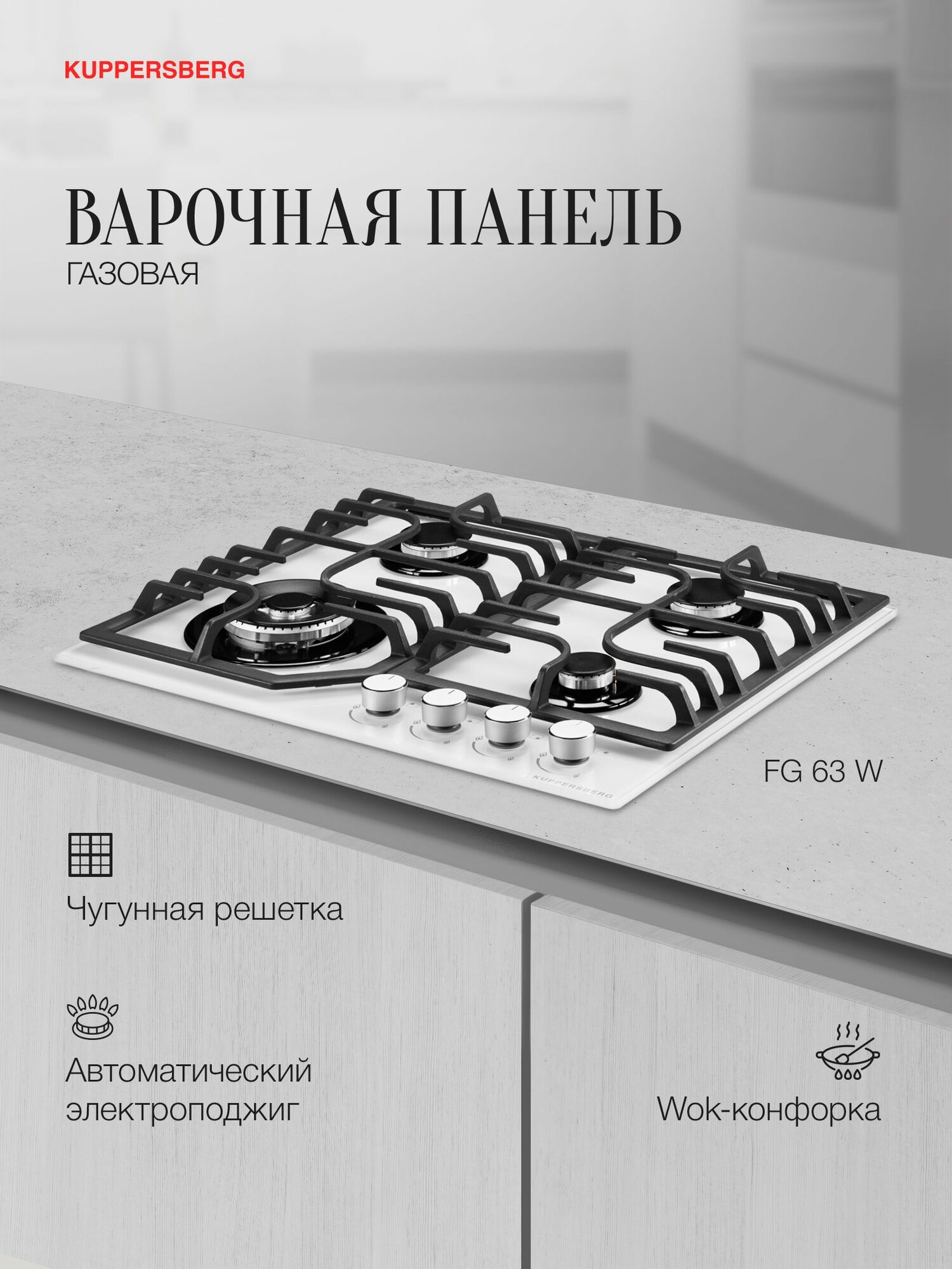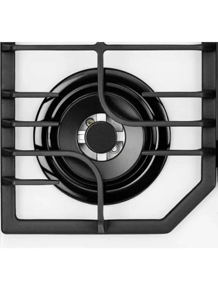 Газовая плита Kuppersberg FG 63 W из белоснежного закаленного стекла для современной кухни. Модель оборудована четырьмя конфорками, в том числе зоной WOK, и чугунными опорами. Управление осуществляется поворотными регуляторами.