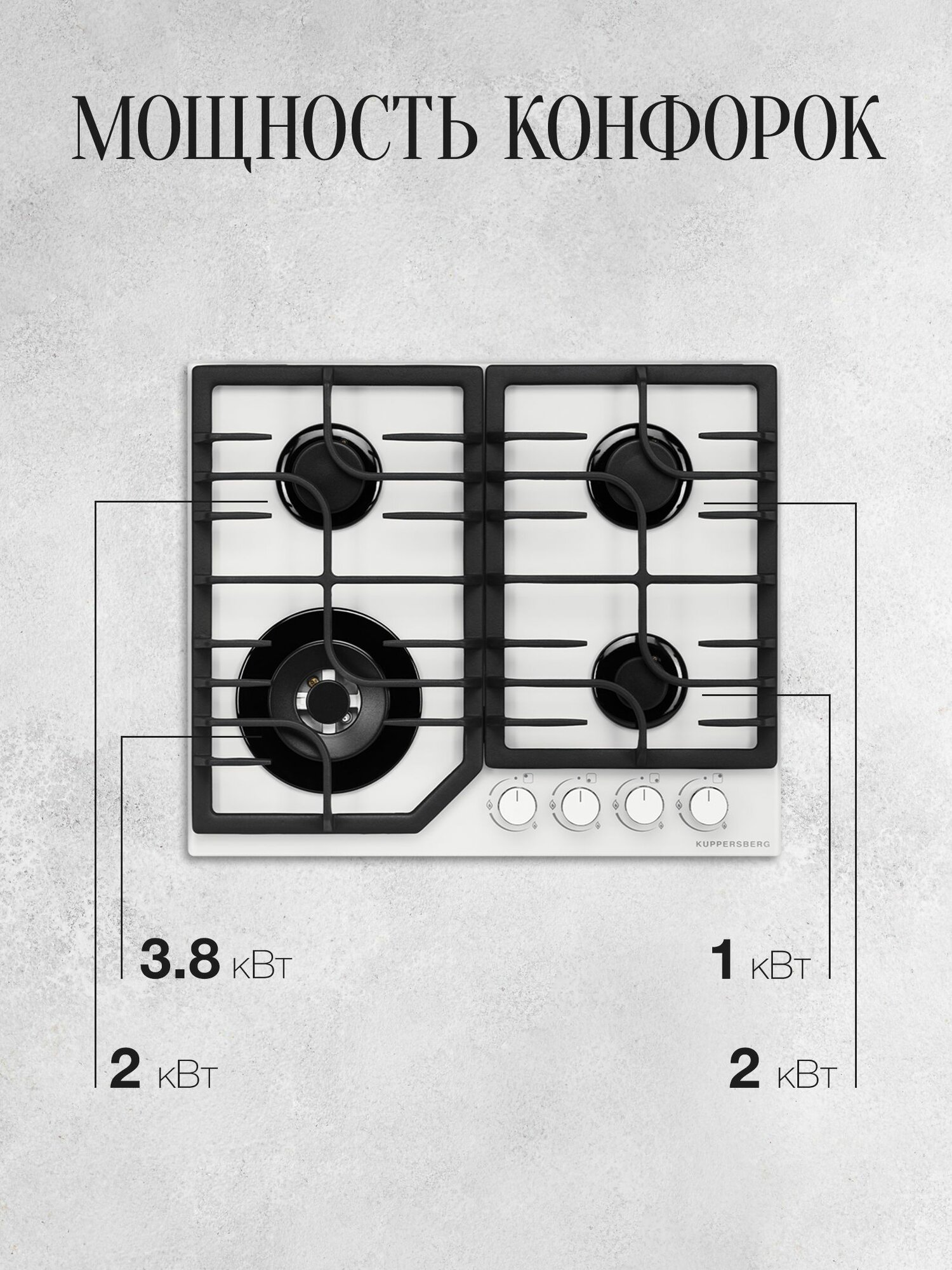 мощность конфорок; передняя левая 3,8 кВт, передняя правая 1,0 кВт, задняя левая 2.0 кВт, задняя правая 2.0 кВт; в комплекте форсунки под сжиженный газ