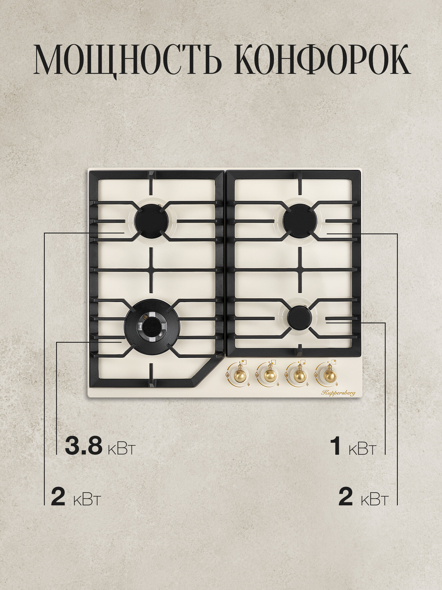 мощность конфорок: передняя левая 2.9 кВт, передняя правая 1,0 кВт, задняя левая 2.0 кВт, задняя правая 2.0 кВт; бронзовый цвет фурнитуры; коллекция Classic