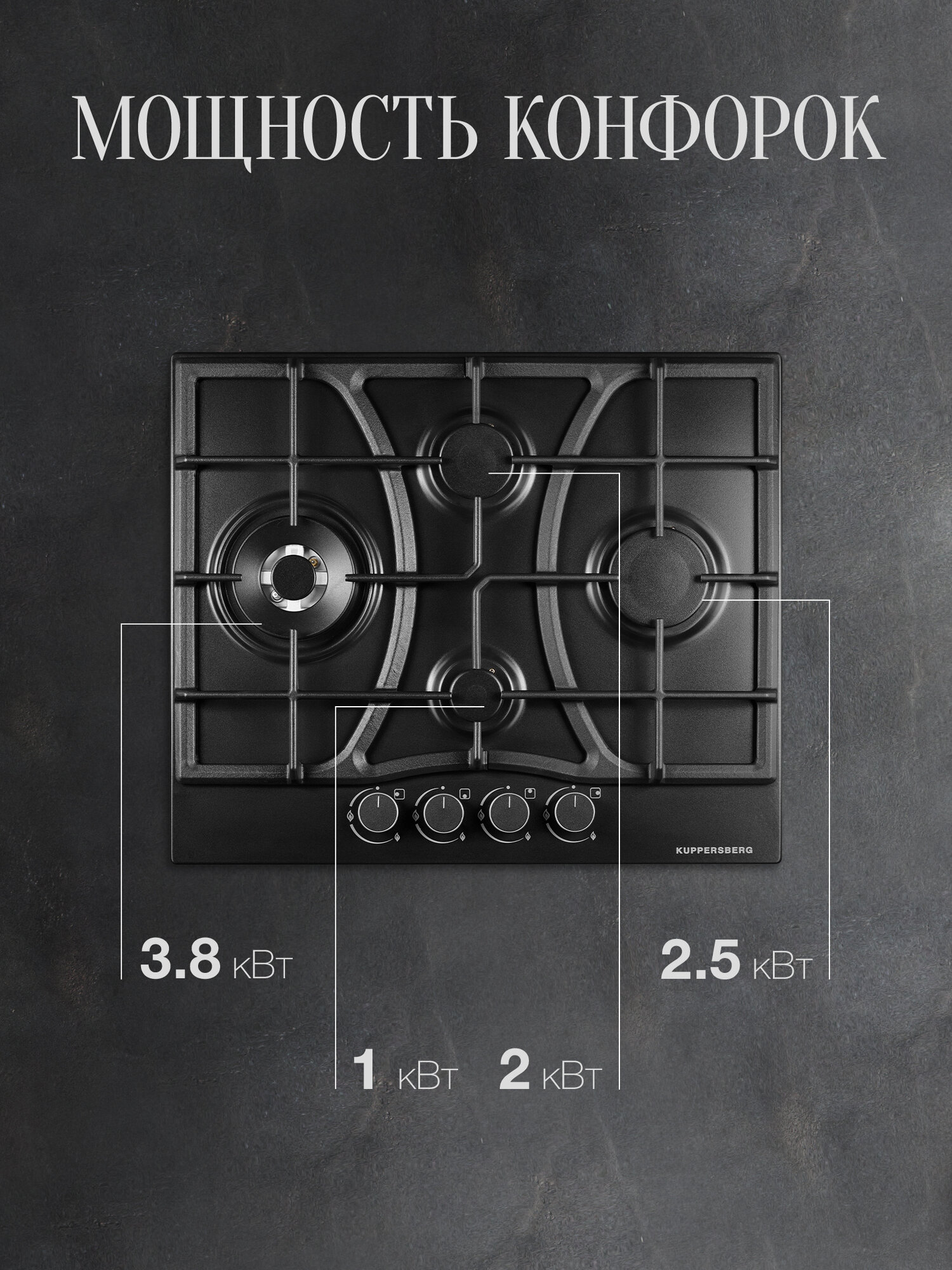 мощность конфорок: передняя 1,0 кВт, задняя 2.0 кВт, левая/конфорка WOK 3.8 кВт, правая 2.5 кВт; цвет поверхности - антрацит; черный цвет фурнитуры; коллекция Hi-Tech