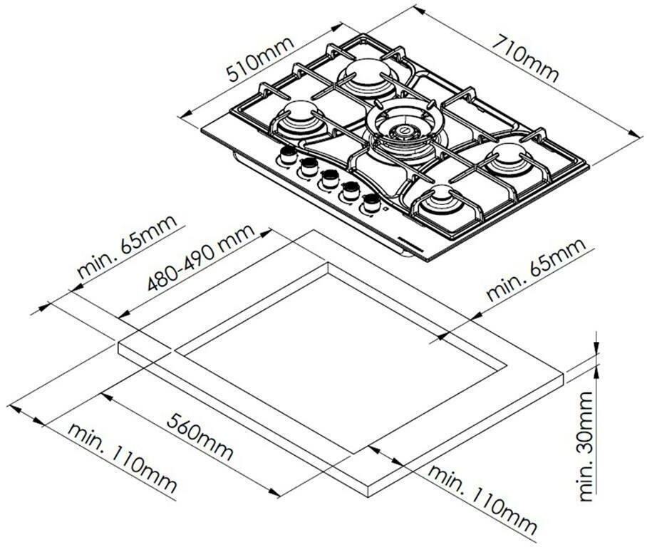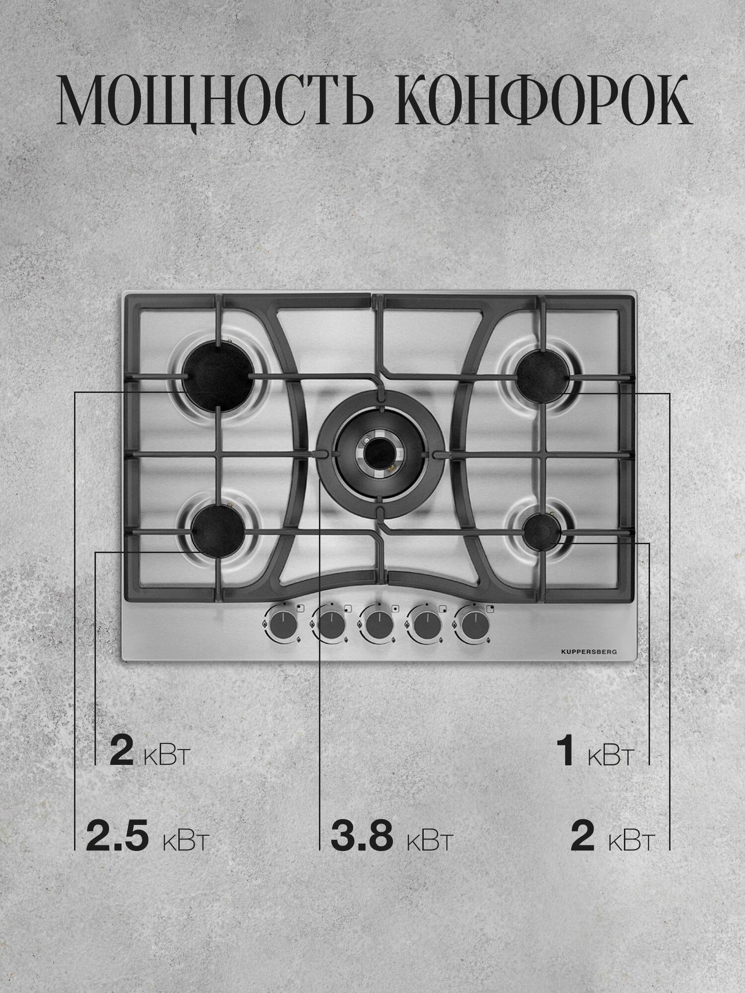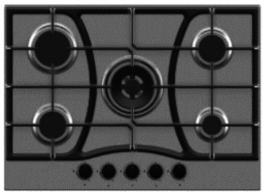 мощность конфорок: передняя левая 2.0 кВт, передняя правая 1,0 кВт, средняя/конфорка WOK 3,8 кВт, задняя левая 2.5 кВт, задняя правая 2.0 кВт; форсунки под сжиженный газ; держатель для турки; нержавеющая сталь; черный цвет фурнитуры