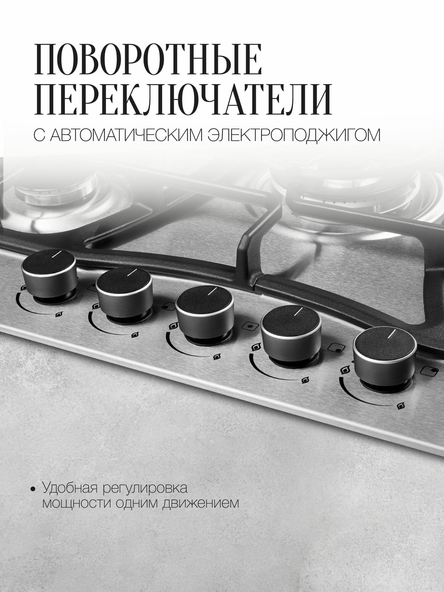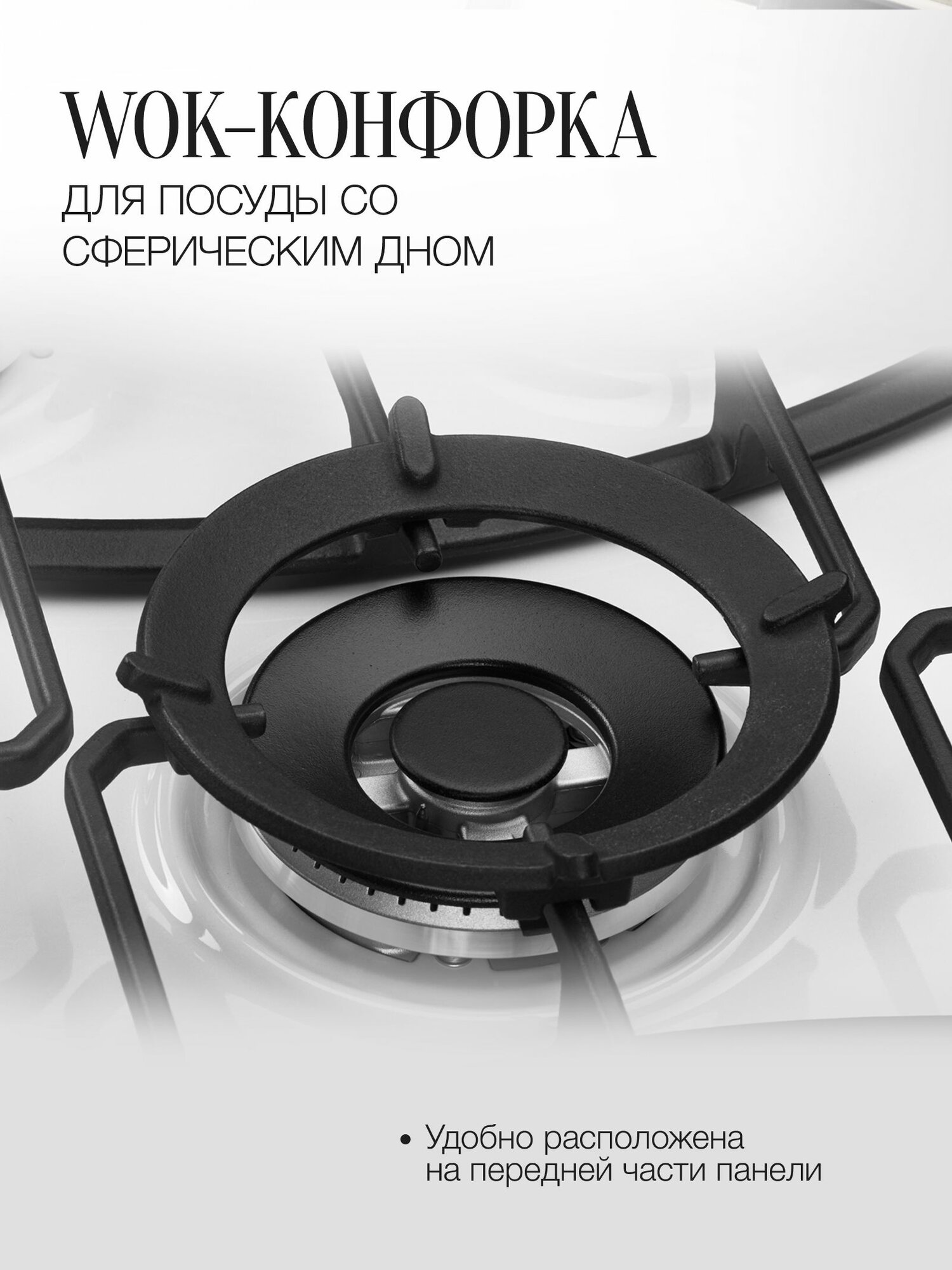 газ-контроль, конфорка WOK, электроподжиг в поворотной ручке, электроподжиг в ручке (автоматический)